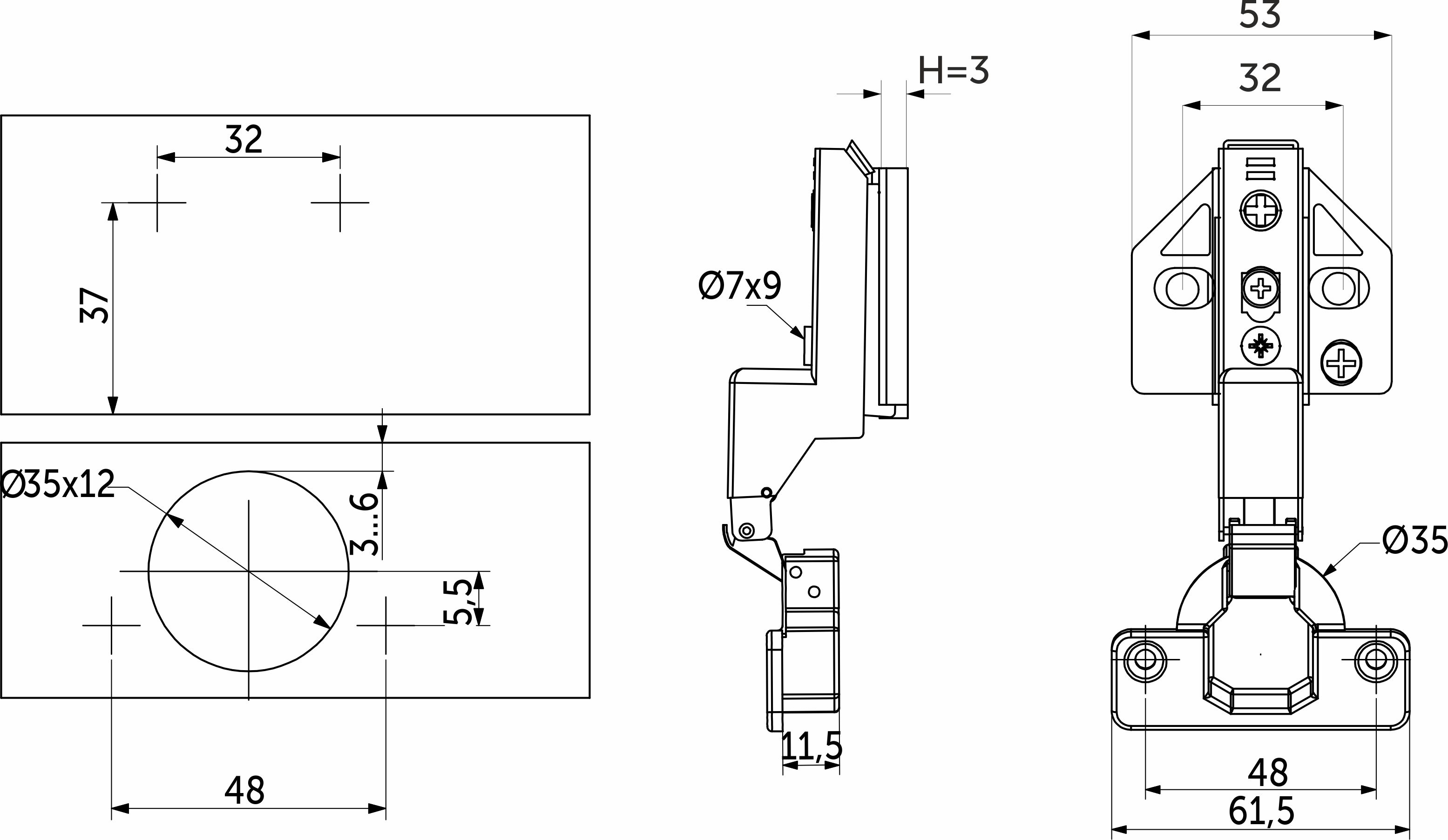 Петля внутренняя с доводчиком 48мм h3 clip-on AKS PLUS 3D (саморезы, заглушки)
