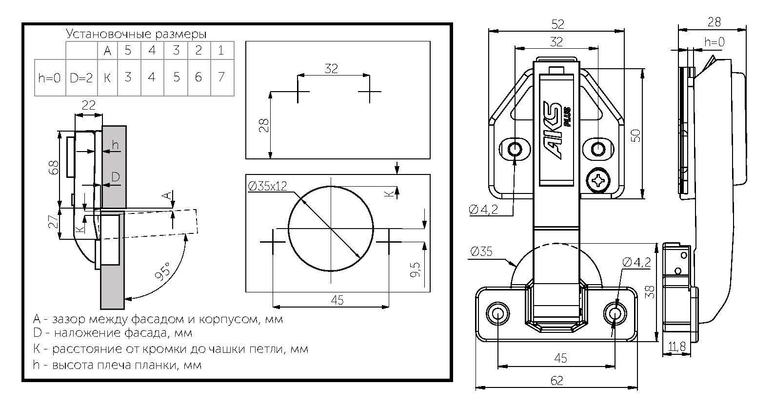 Петля под фальшпанель 90° с доводчиком 45мм h0 clip-on AKS PLUS 3D (саморезы, заглушки)