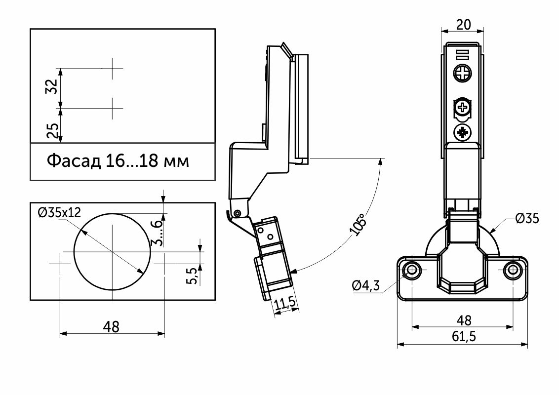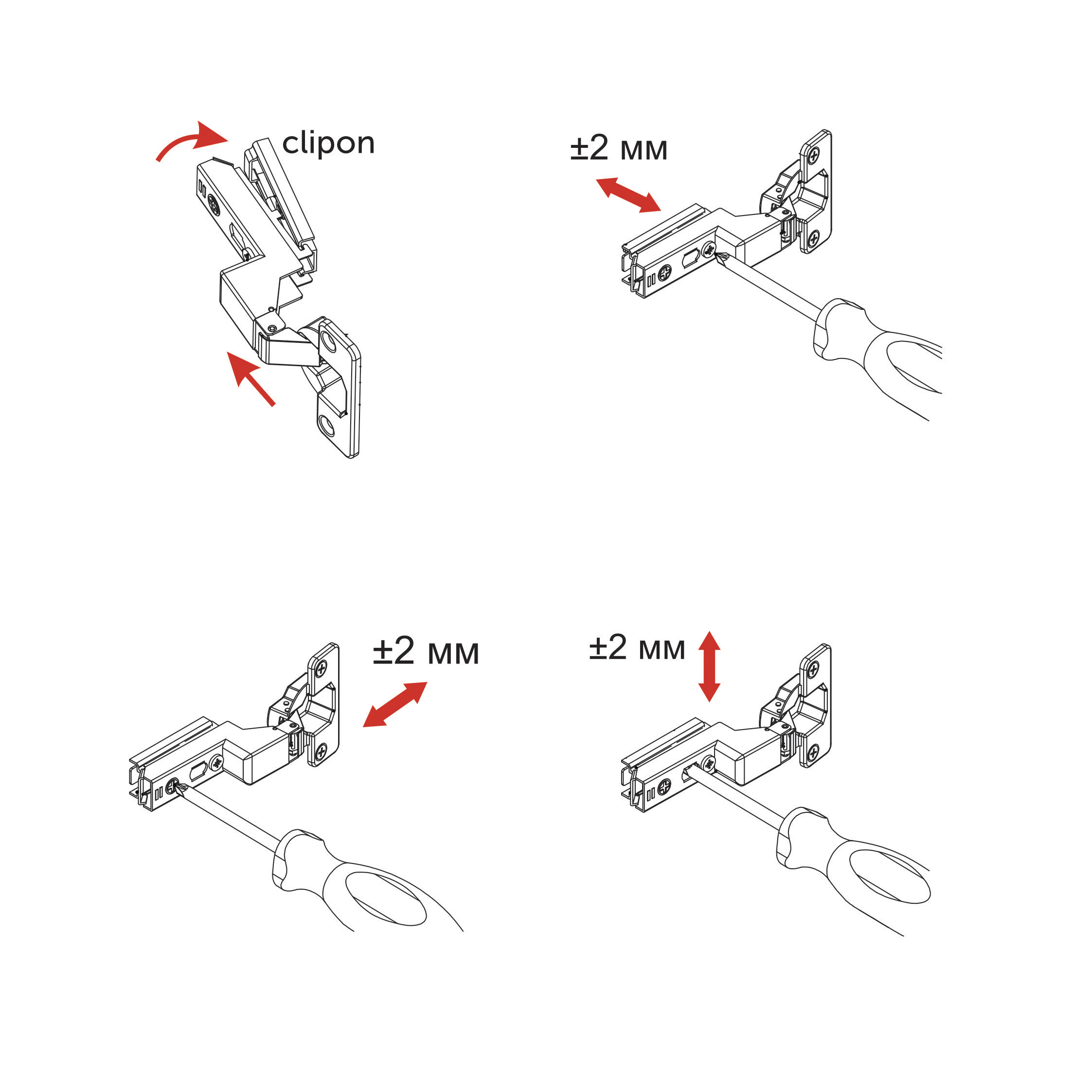 Петля внутренняя с доводчиком и системой быстрого монтажа clip on. Имеет современную систему регулировки в трех плоскостях по +/- 2 мм при помощи эксцентриковых винтов в планке и теле петли. Межцентровое расстояние в чашке 45 или 48 мм. Петля имеет массу 105 грамм и изготовлена из высокопрочной холоднокатаной стали. Имеет встроенный демпфер, что обеспечивает плавность закрытия петли. Имеет два угла открывания на 75 и 105 градусов. В комплекте идут декоративные накладки на тело и на чашку для маскировки винтов крепления. Особенностью является узкая ответная планка, которая обеспечивает эстетичный вид петли.