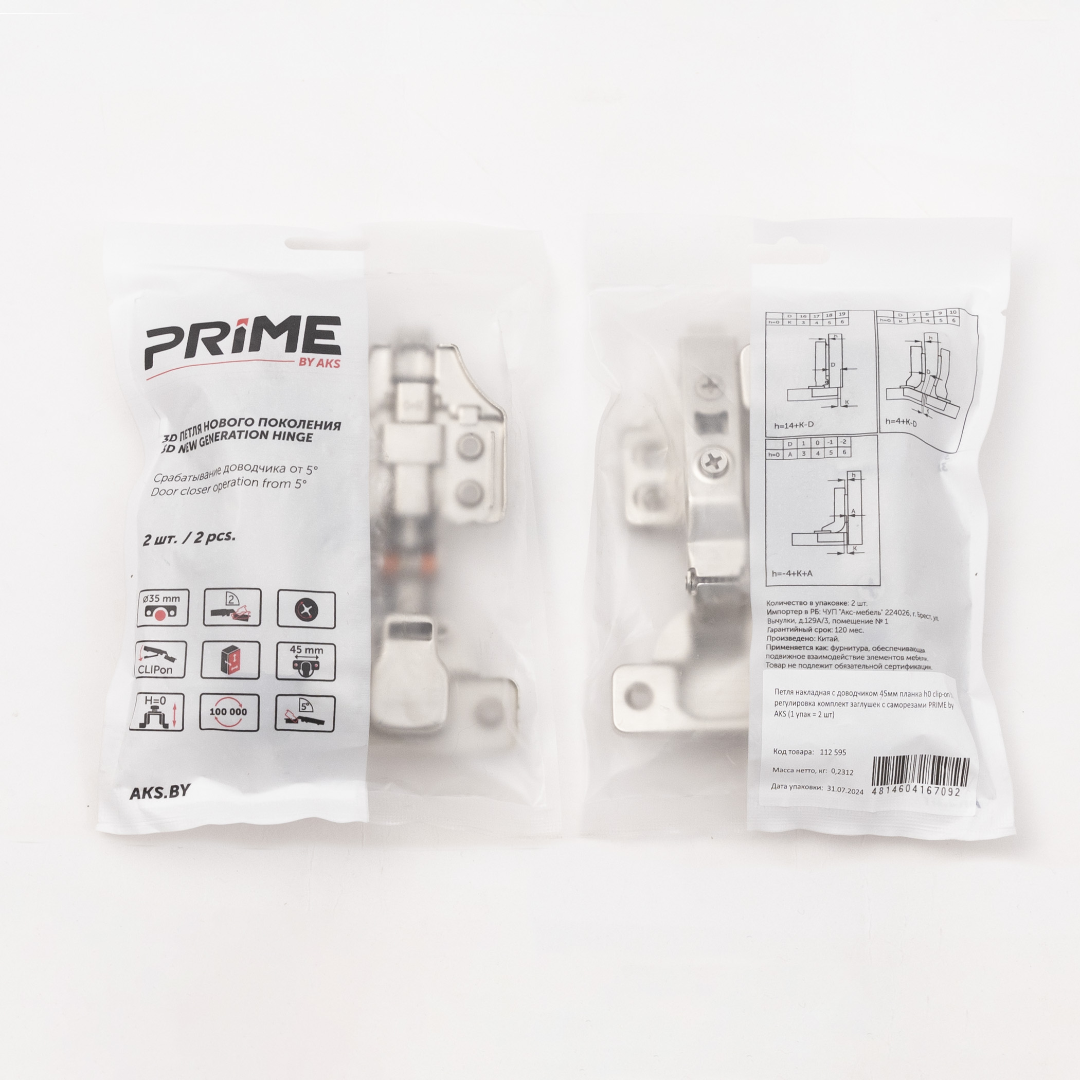 Петля накладная с доводчиком 45мм h0 clip-on PRIME by AKS 3D (саморезы, заглушки) (упак. = 2 шт.)