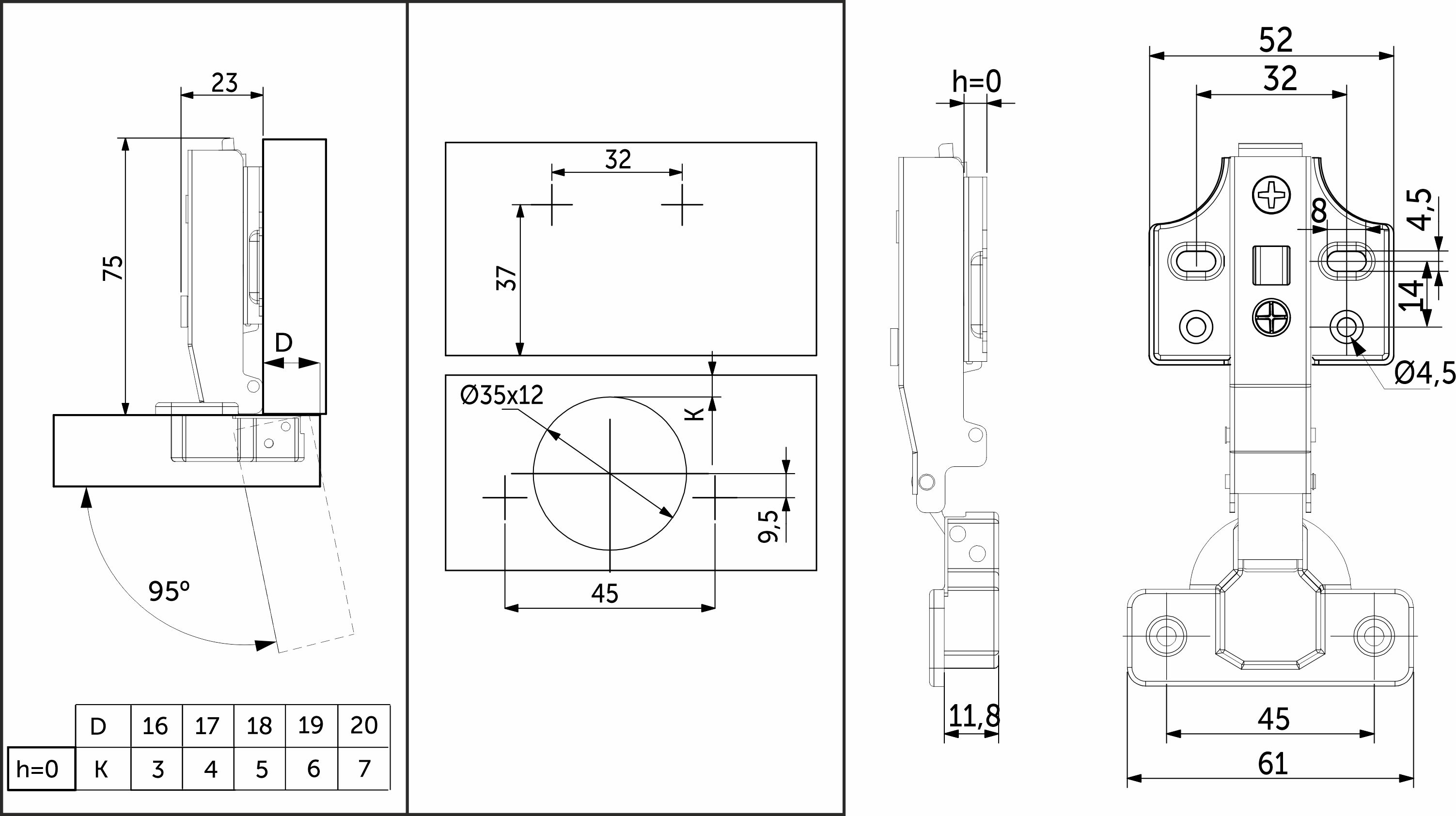 Данная петля подходит для фасадов толщиной от 15 до 28 мм, имеет межцентровое расстояние между отверстиями в чашке в 45мм, а также монтажную планку на четыре отверстия высотой h0 для более надежного крепления петли к корпусу мебели.