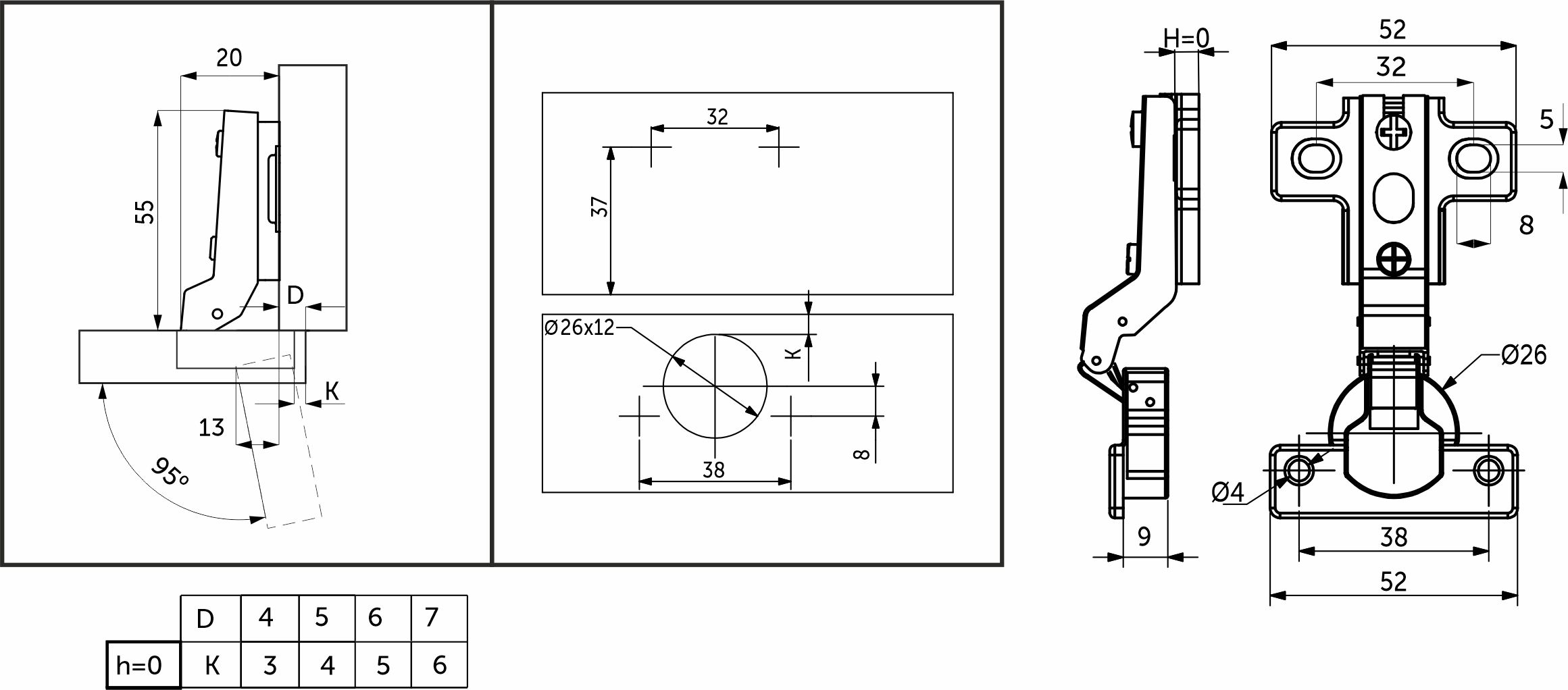 Петля предназначена для установки на фасад. Межцентровое расстояние в чашке 38 мм.