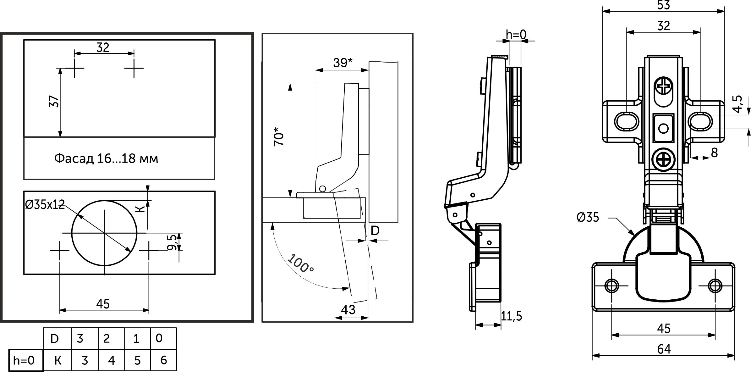 Петля предназначена для фасадов толщиной от 15 до 22 мм, имеет межцентровое расстояние между отверстиями в чашке в 45мм, а также высоту монтажной планки h0.