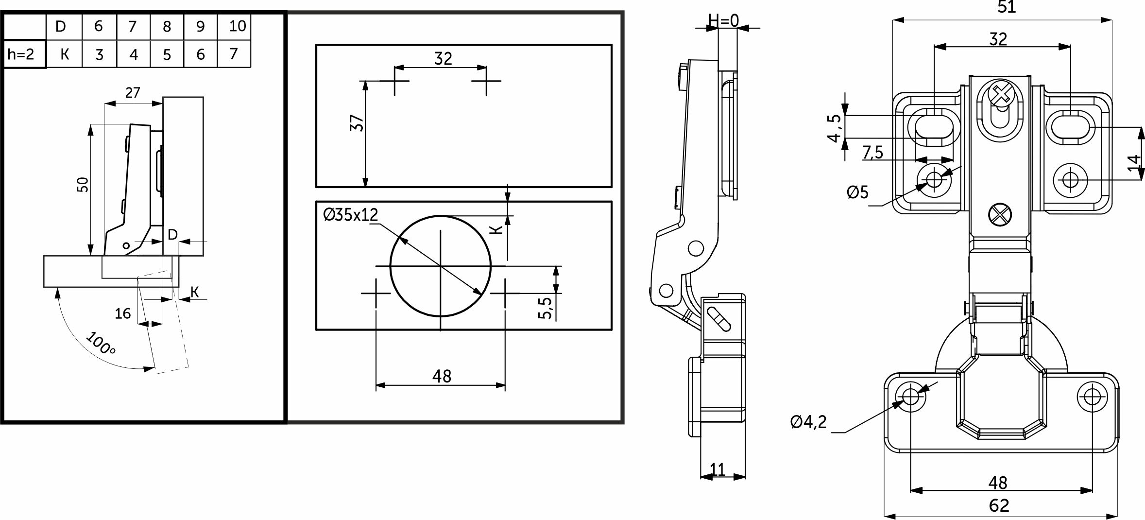 Изготовлена из холоднокатанной стали. Диаметр чашки петли составляет ∅35 мм. Глубина чашки 11,5 мм. Глубина сверления, необходимая для установки, 12 мм.