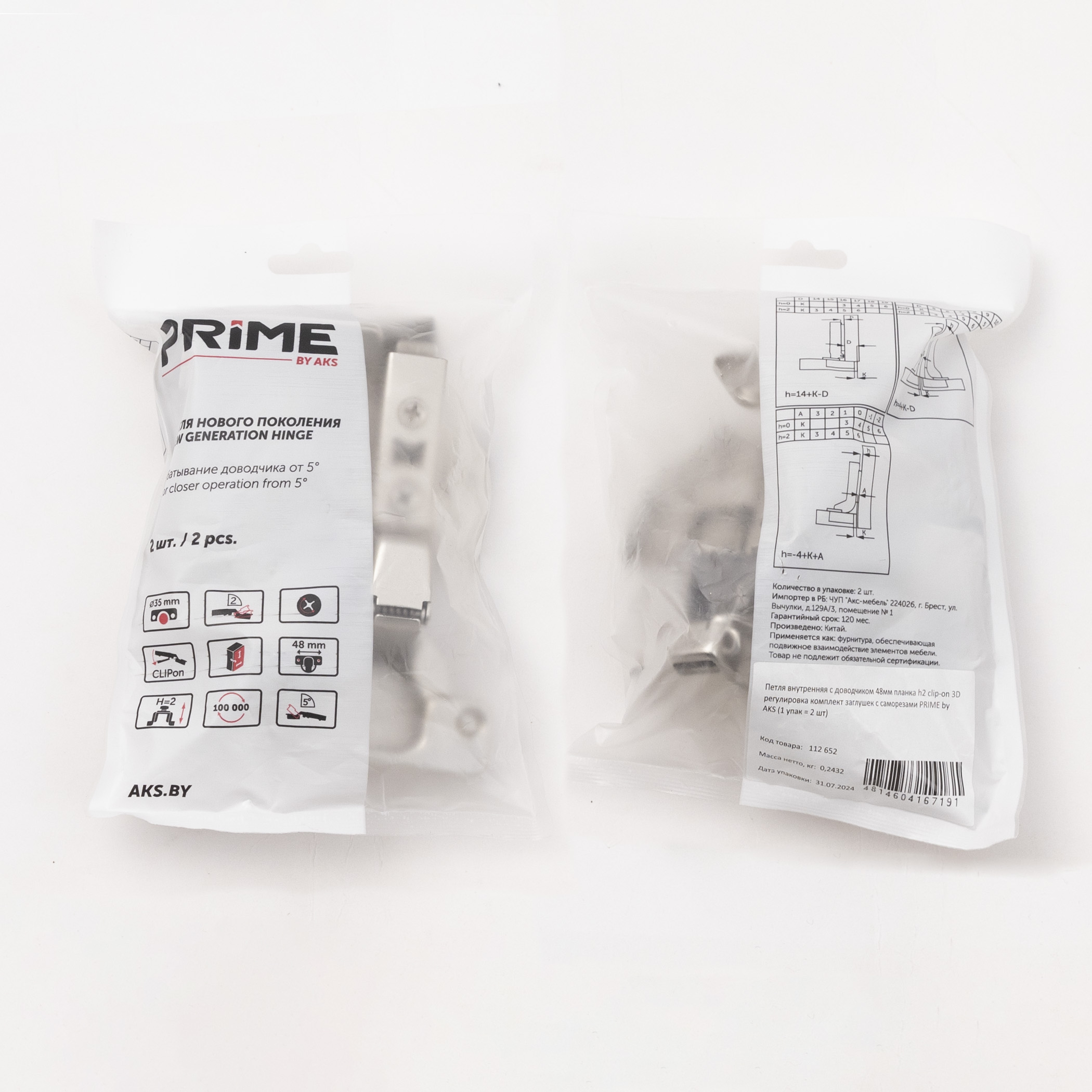Петля внутренняя с доводчиком 48мм h2 clip-on PRIME by AKS 3D (саморезы, заглушки) (упак. = 2 шт.)