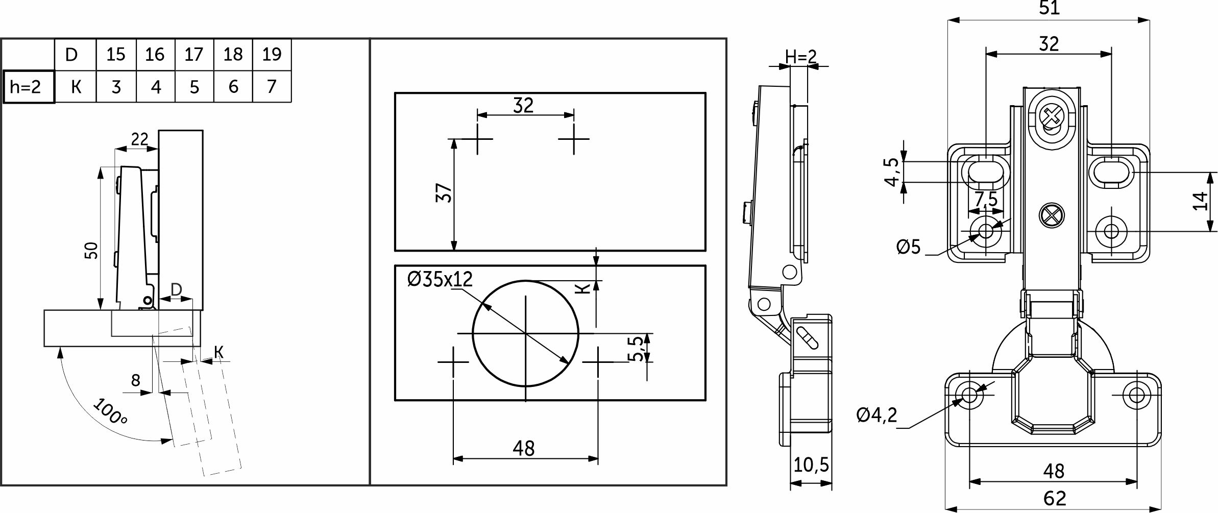 Петля предназначена для фасадов толщиной от 15 до 22 мм, имеет межцентровое расстояние между отверстиями в чашке в 48мм, а также высоту монтажной планки h0.