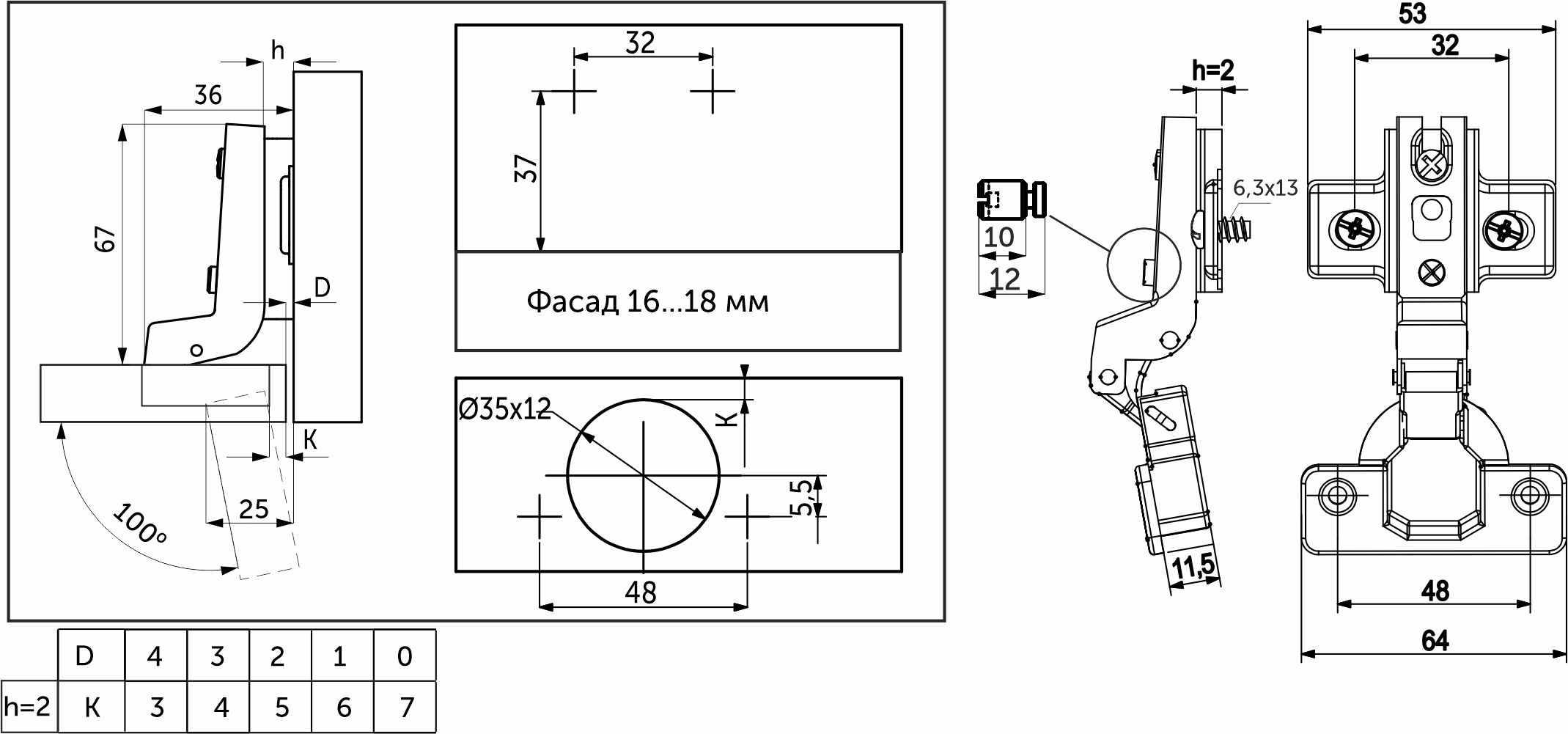 Петля предназначена для фасадов толщиной от 15 до 22 мм, имеет межцентровое расстояние между отверстиями в чашке в 48мм, а также высоту монтажной планки h2.