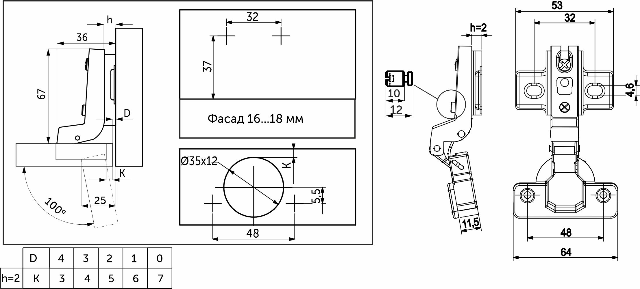 Петля предназначена для фасадов толщиной от 15 до 22 мм, имеет межцентровое расстояние между отверстиями в чашке в 48мм, а также высоту монтажной планки h2.