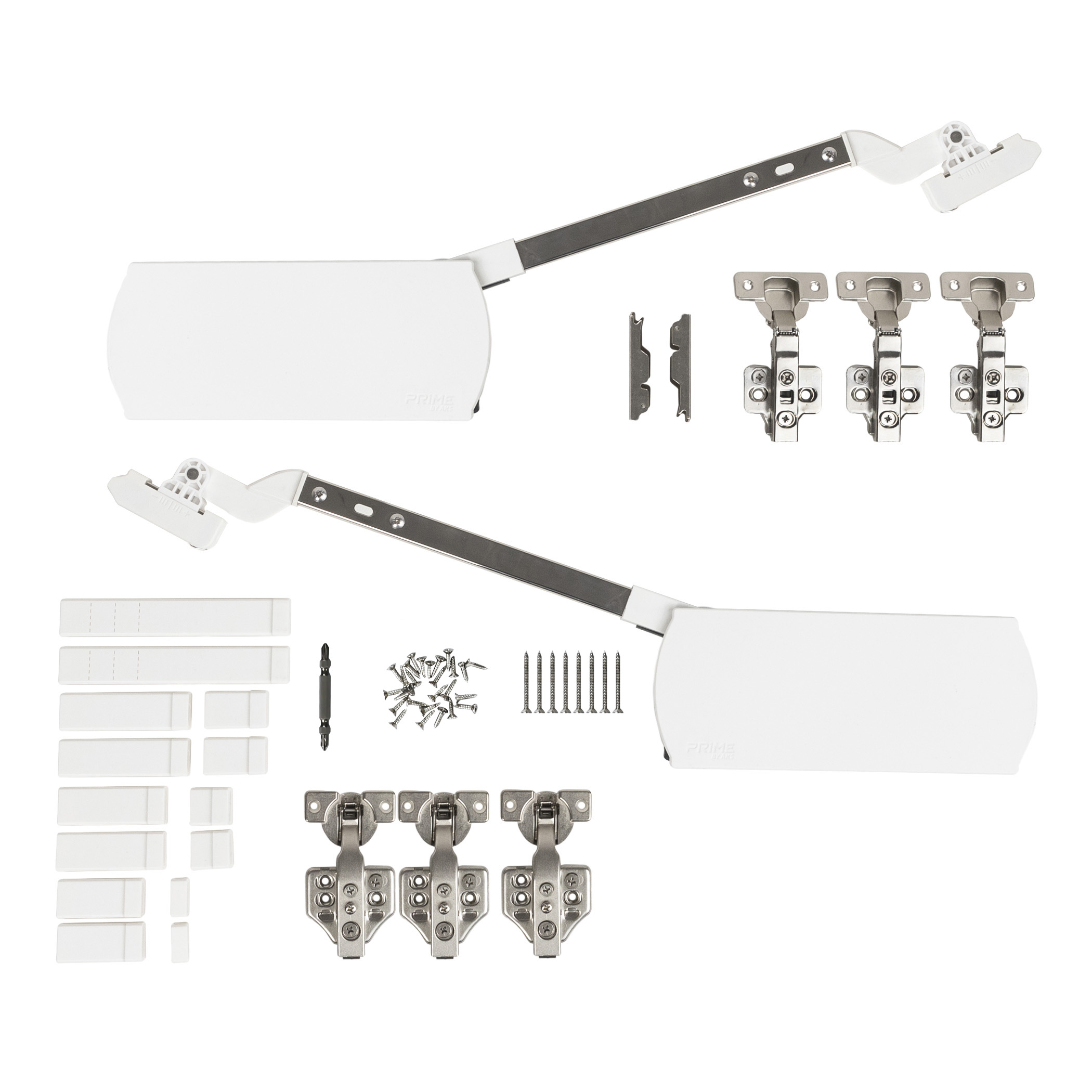 В комплект входят: подъемный механизм (2 шт.), пластиковые заглушки (2 шт.), крепление фасада (2 шт.), бита (1 шт.), верхняя петля (3 шт.), промежуточная петля для предотвращения защемления пальцев (3 шт.), саморезы 3,6х16 мм (37 шт.), саморез 4х40 мм (8 шт.), декоративные заглушки плеча, комплект шаблонов для установки, инструкция по установке.