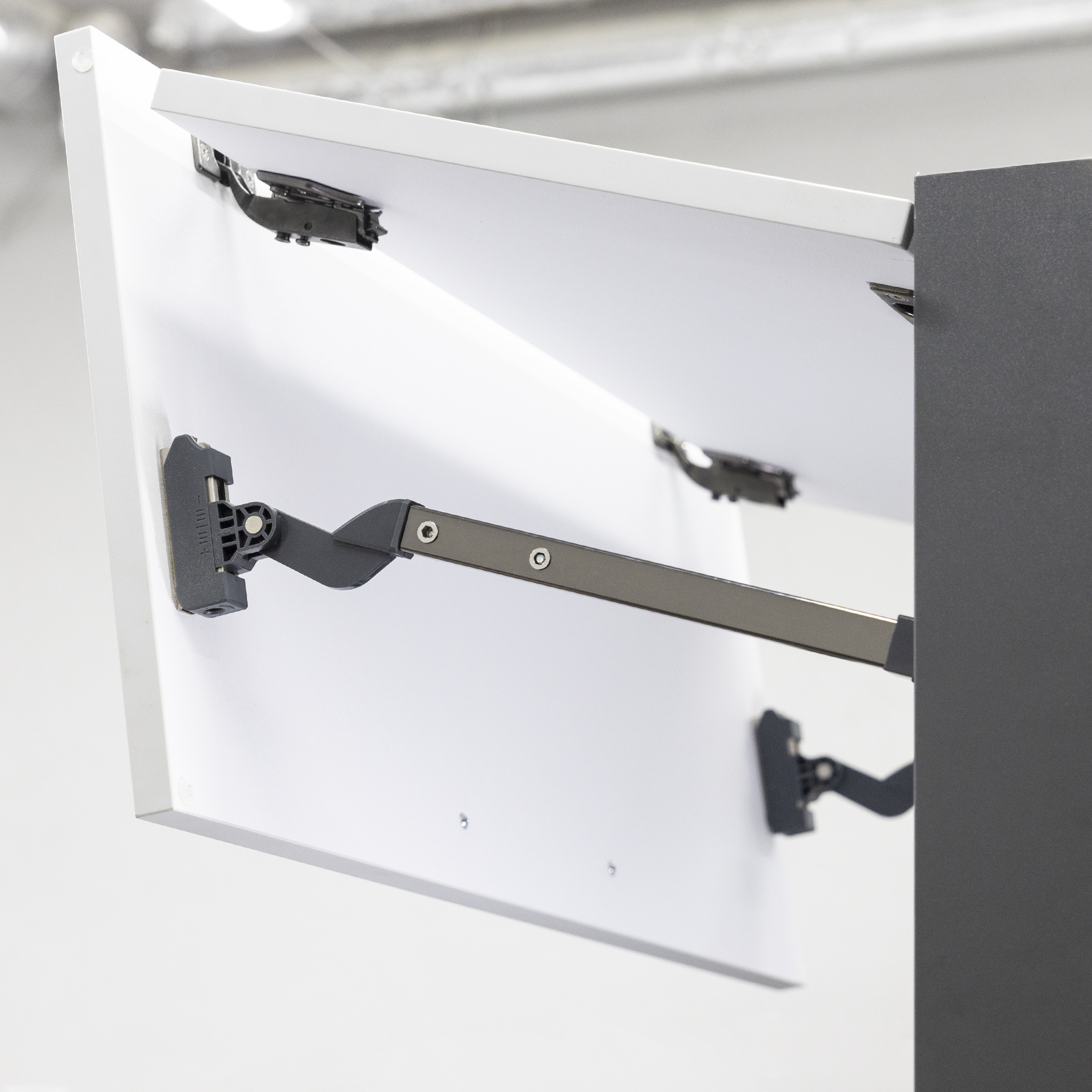 Регулировки: мощности подъемника, усилия и угла срабатывания доводчика, длины рычага, угла открывания фасада (85° и 100°).