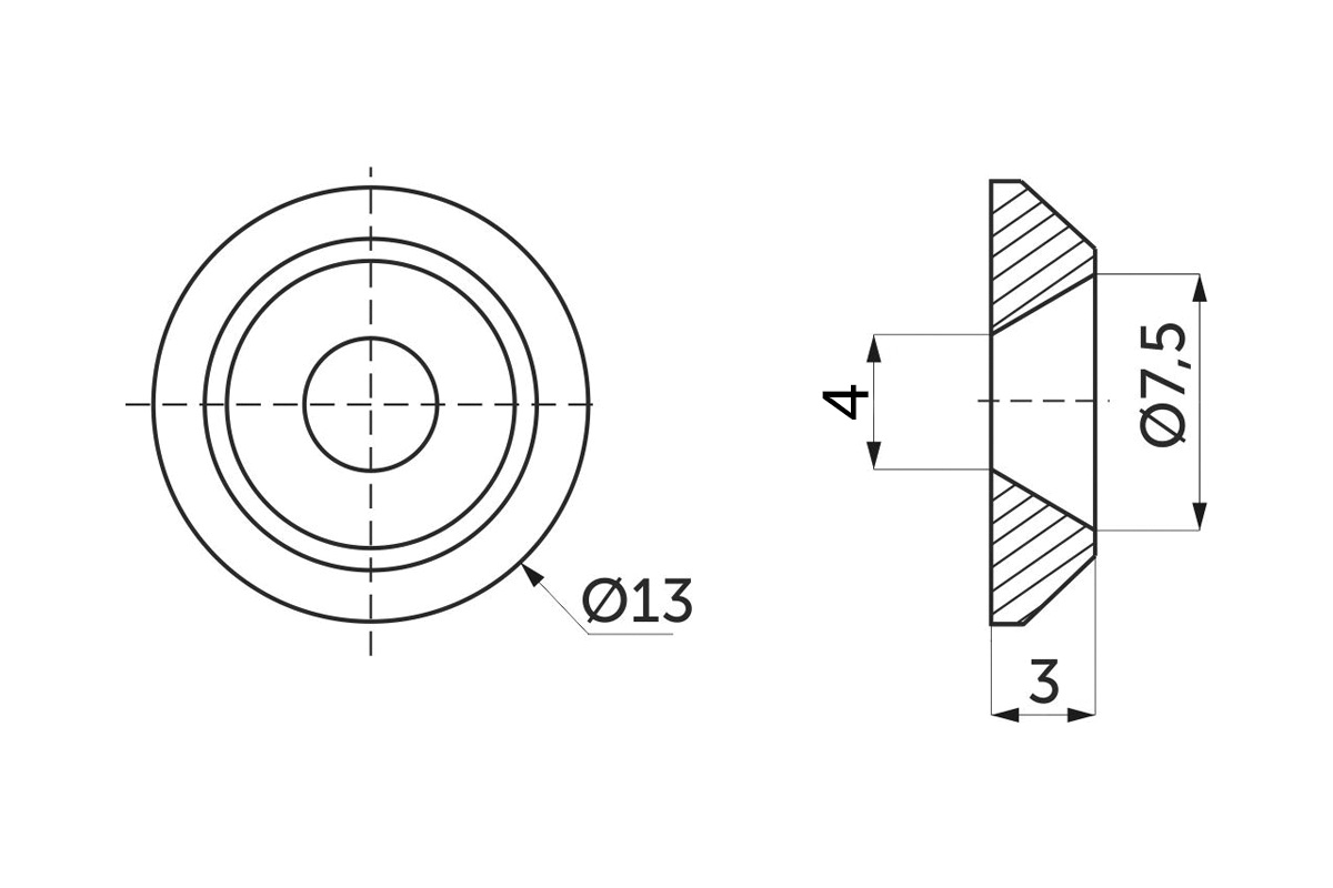 Пластиковая подкладка под винт для ручек применяется для крепления ручек к мебельным фасадам из различных материалов. Она принимает функцию шайбы - увеличение площади прижима, что позволяет применить большее усилие затяжки, предохраняет поверхность скрепляемых деталей (конструкций) от повреждений (актуально для фасадов из стекла, металла и т.п.), а также увеличивает степень уплотнения соединения (в т.ч. может компенсировать излишнюю длину винта если фасад тонкий или глубина резьбы в ручке недостаточна). Наружный диаметр данного изделия - 13 мм. Внутренний диаметр отверстия - 4 мм. Цвета изделия: белый, молочный и бесцветный (полупрозрачный).