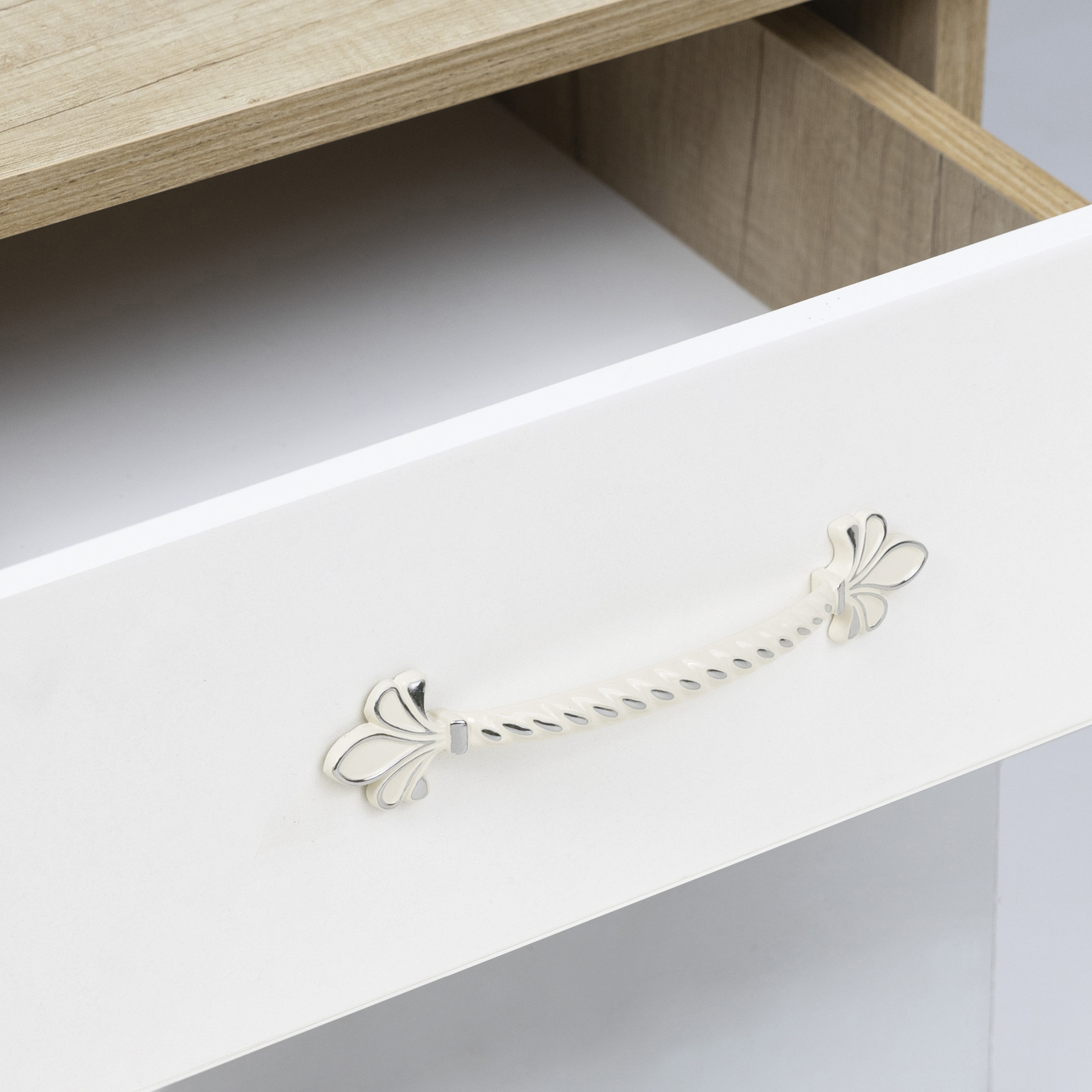 В форме ручки четко прослеживаются цветочные мотивы, а сочетание цветов белый-золото и белый-серебро создает эффект патинирования.