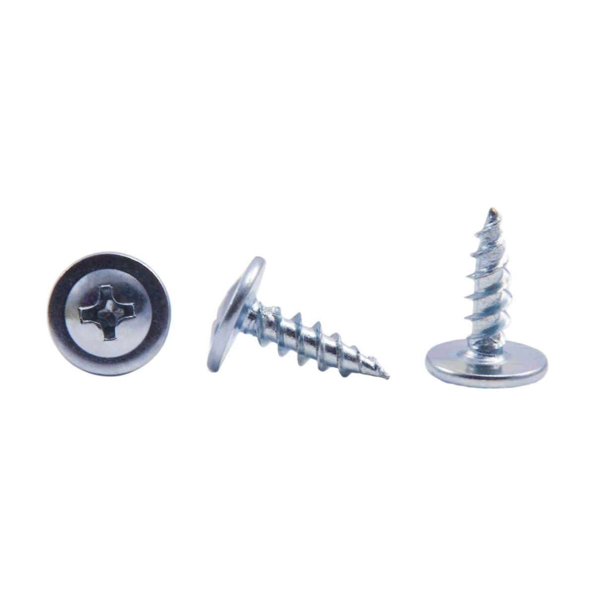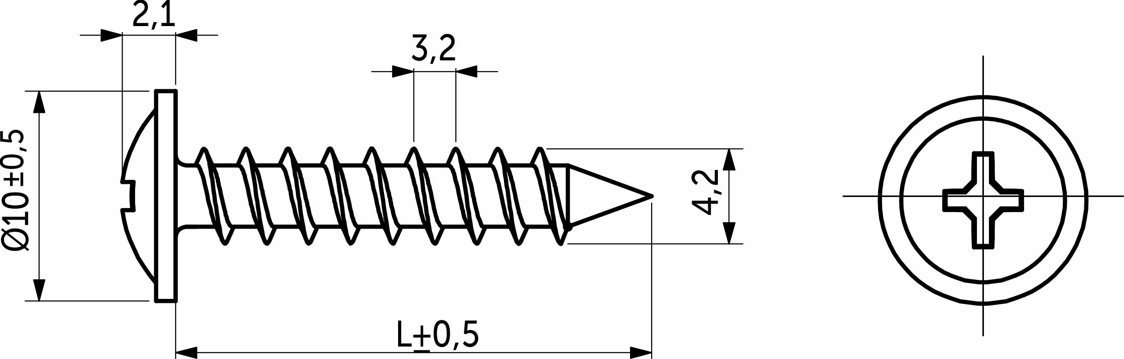 d = 10,6-10,8 Материал: сталь. Головка полусферическая с пресс-шайбой, частая резьба, наконечник острый. Саморезы с прессшайбой имеют увеличенную головку для более плотного и надежного примыкания самореза к прикручиваемой поверхности. Шлиц у данных саморезов - PH. Диаметр стержня 4,2 мм, а основные длины применяемые в мебельном производстве 13, 16, 19, 25 и 32 мм. Покрытие - белый цинк. Существует две разновидности острия данных саморезов - острые и со сверлом на кончике, для просверливания тонкого металла.