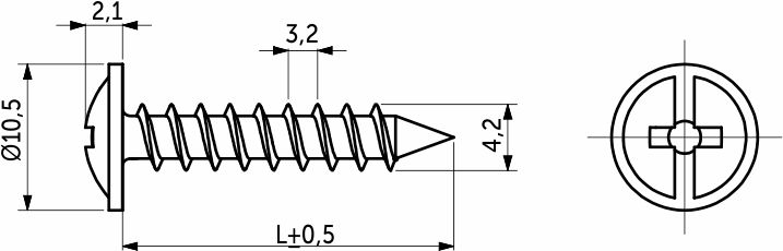 d = 10,6-10,8 Материал: сталь. Головка полусферическая с пресс-шайбой, частая резьба, наконечник острый. Саморезы с прессшайбой имеют увеличенную головку для более плотного и надежного примыкания самореза к прикручиваемой поверхности. Шлиц у данных саморезов - PH. Диаметр стержня 4,2 мм, а основные длины применяемые в мебельном производстве 13, 16, 19, 25 и 32 мм. Покрытие - белый цинк. Существует две разновидности острия данных саморезов - острые и со сверлом на кончике, для просверливания тонкого металла.