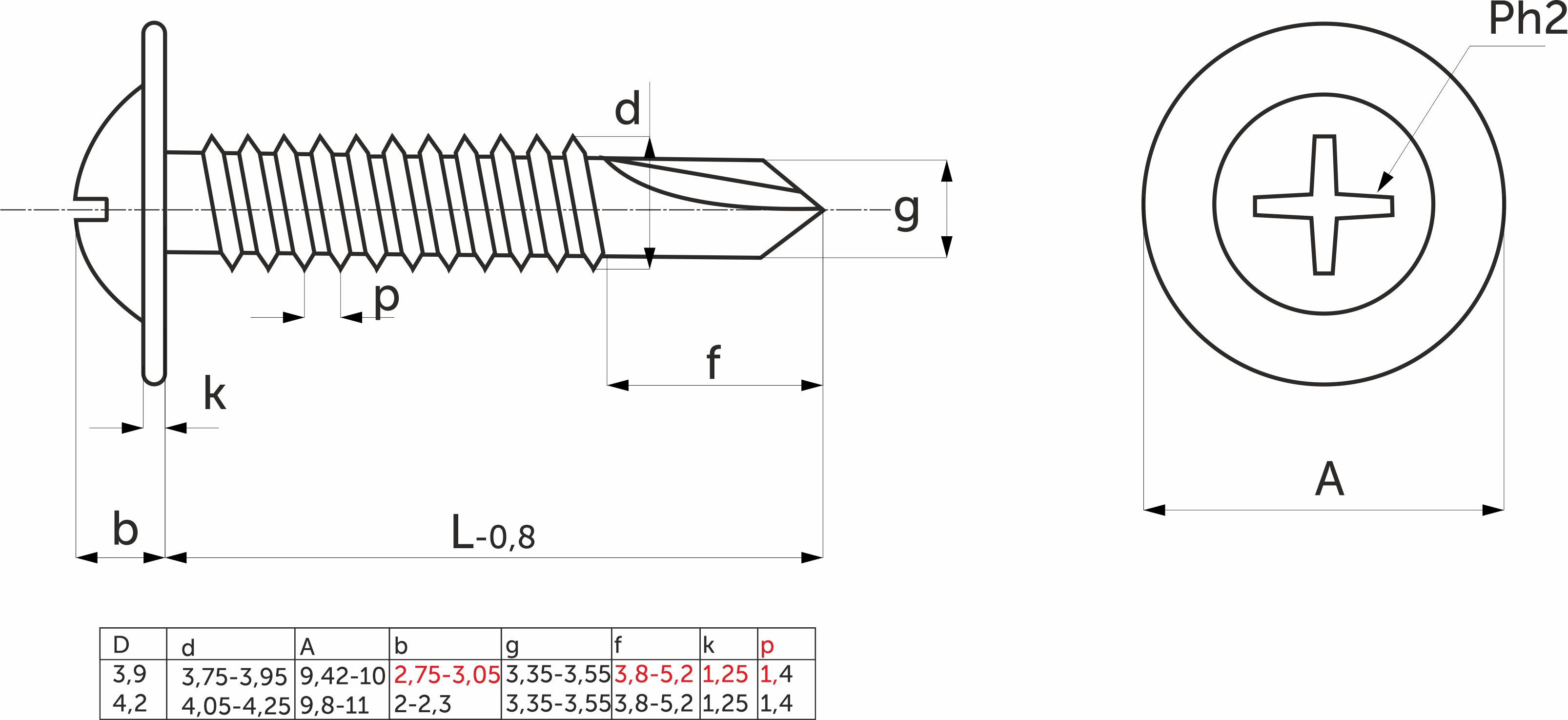 Головка полусферическая с пресс-шайбой, частая резьба, наконечник сверло (для просверливания тонкого металла).