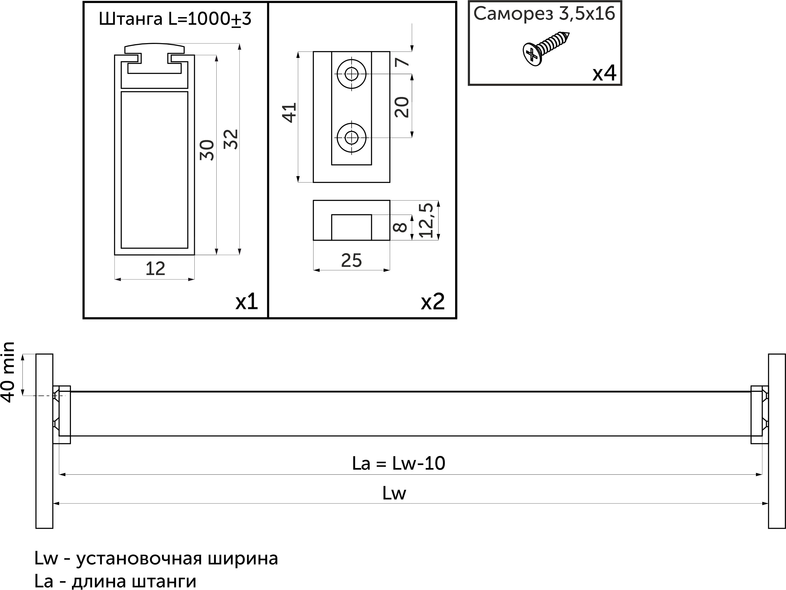 В комплекте: труба гардеробная прямоуг. L-1000 с демпфером - 1 шт., держатель концевой - 2 шт., PH саморез с потайной головкой d3*16 - 4 шт