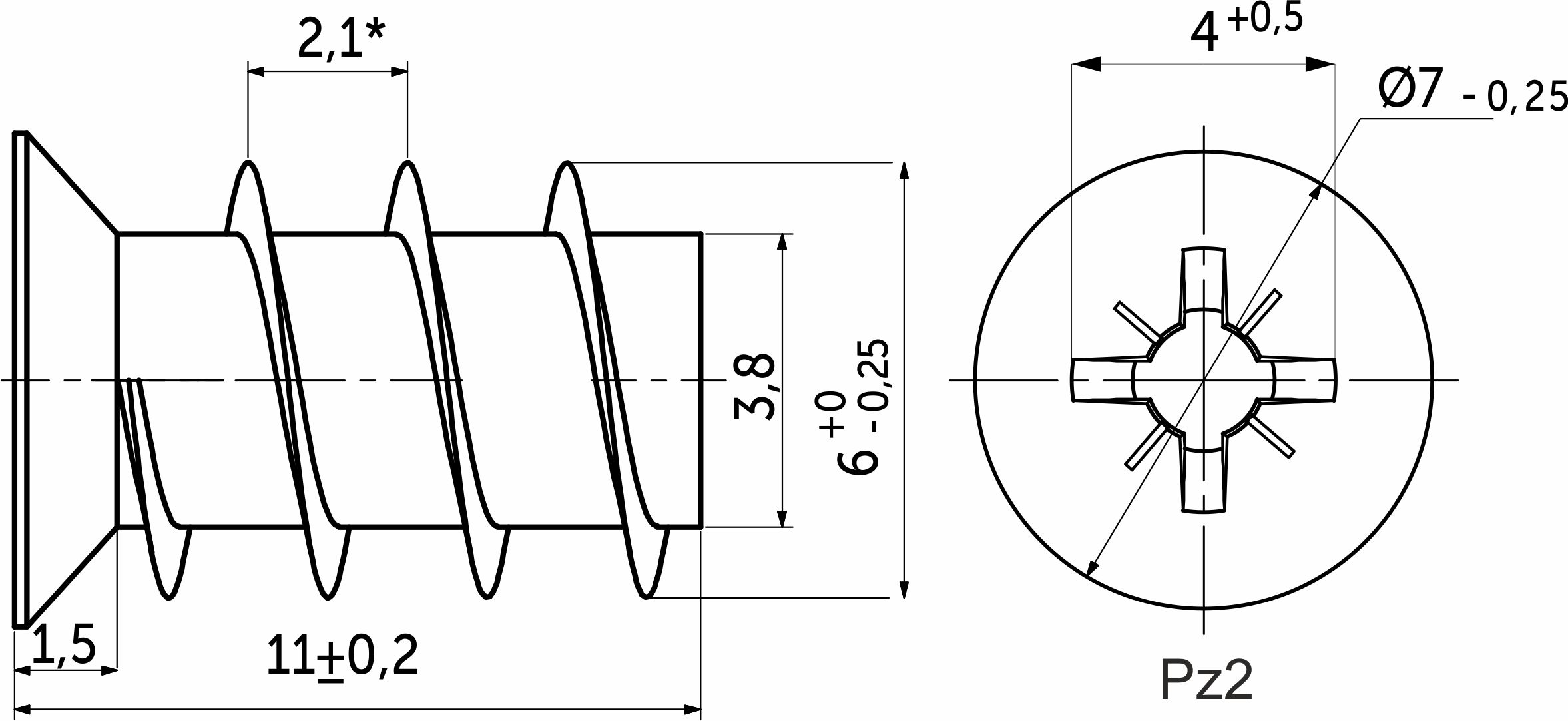 Евро-шуруп (ES) имеет потайную головку, диаметр стержня 6,0 мм и тупой наконечник.