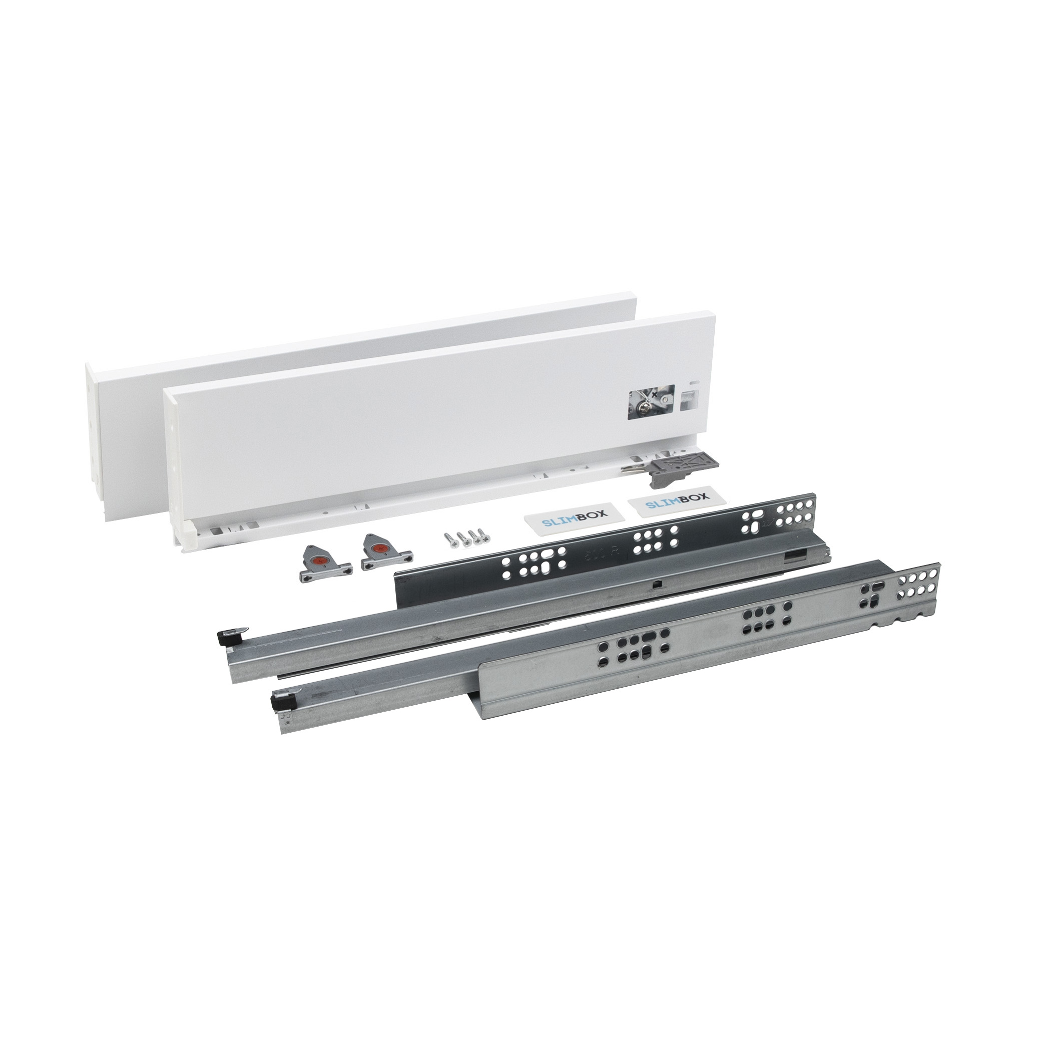 Комплект системы выдвижения с тонкими (до 12 мм) стальными боковинами в высотах от 86 до 175 мм благодаря чему увеличивает вместимость ящика на 20%. Доступны в двух цветах: белый и графит. В состав комплекта включена пара боковин, пара направляющих, крепления фасада, заглушки, саморезы, инструкция. Для изготовления выдвижного ящика понадобится только самостоятельно изготовить дно ящика, заднюю стенку и фасад. Металлбокс оснащен системой регулировки в двух плоскостях для позиционирования фасада относительно корпуса и соседних фасадов. Ящик рассчитан на 45 кг постоянной эксплуатационной нагрузки, срок службы данного изделия -100 000 циклов. Представлен ящик в длинах от 300 до 550 мм.