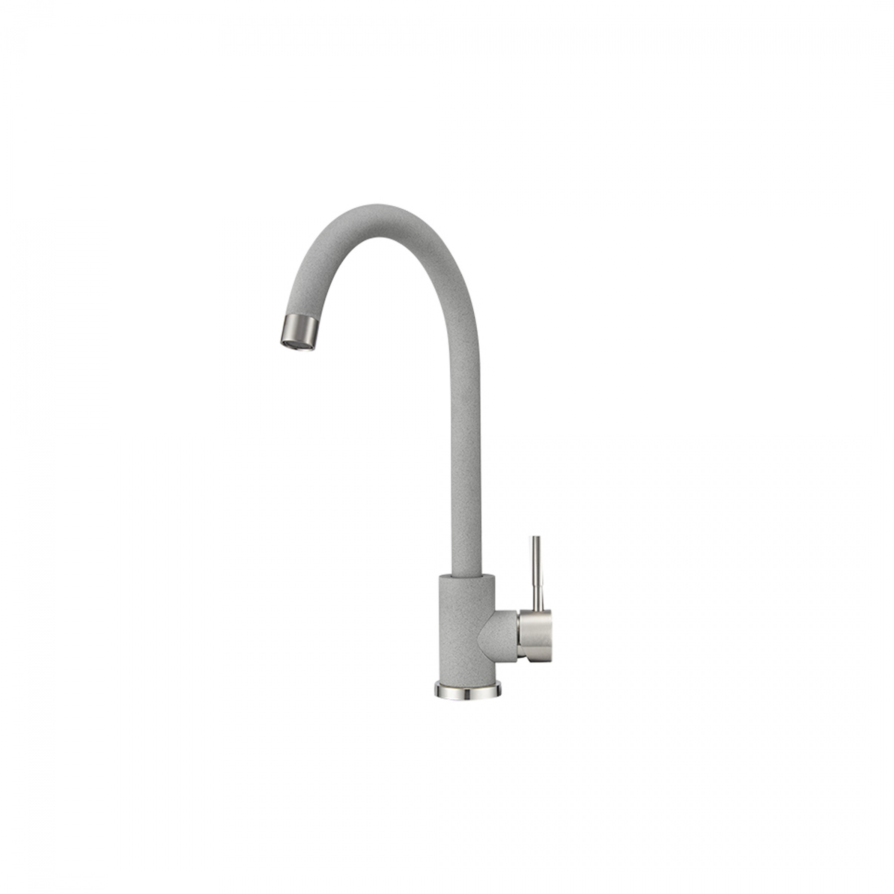 Вращается на 360°. Выполнен из нержавеющей стали и подходит к мойкам из кварца и камня. Имеет высокий излив и однорычажную систему.