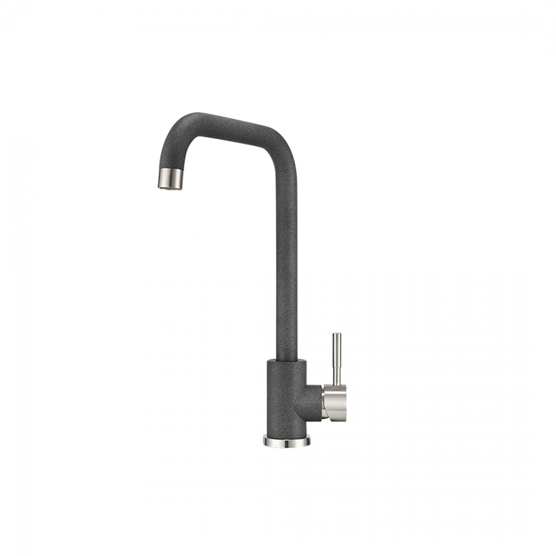 Вращается на 360°. Выполнен из нержавеющей стали и подходит к мойкам из кварца и камня. Имеет высокий излив и однорычажную систему.
