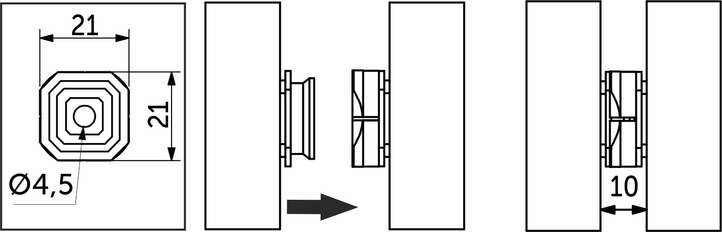 Данные кондукторы при нажатии оставляют отметку для места крепления наружного соединителя на внутренней части устанавливаемой панели. Кнопочные соединители панелей монтируются с помощью саморезов соответствующей длины (по центру крепления находится монтажное отверстие диаметром 5 мм), либо могут фиксироваться к поверхности с помощью клея.