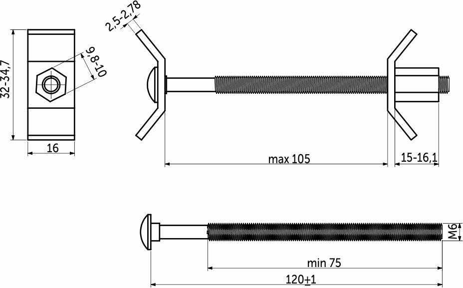 Стяжка для столешниц, как следует из её названия, применяется для соединения секций столешниц в одной плоскости. Она состоит из двух С-образных шайб, шпильки с метрической резьбой М6 и удлиненной шестигранной гайки. Существует несколько основных размеров данной стяжки, которые отличаются только длиной и самые популярные из них 65, 100, 120 и 150 мм.