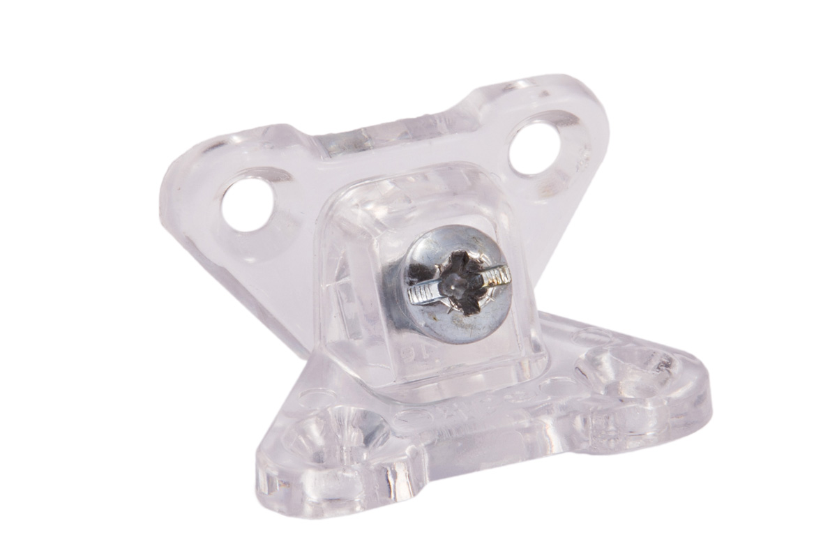 Уголок двухсоставной, в комплект входит 2 части уголка + винт. Весовая нагрузка до 200 кг. Стяжка-бабочка или «Butterfly». Название свое она получила из-за внешнего сходства с формой крыльев бабочки. Стяжка-бабочка может быть двух исполнениях – металлический корпус и пластиковый прозрачный корпус. Эта стяжка состоит из двух частей, каждая из которых прикручивается саморезами к соответствующей детали и путем наложения с помощью винта, поставляющегося в комплекте, происходит надежное стягивание.