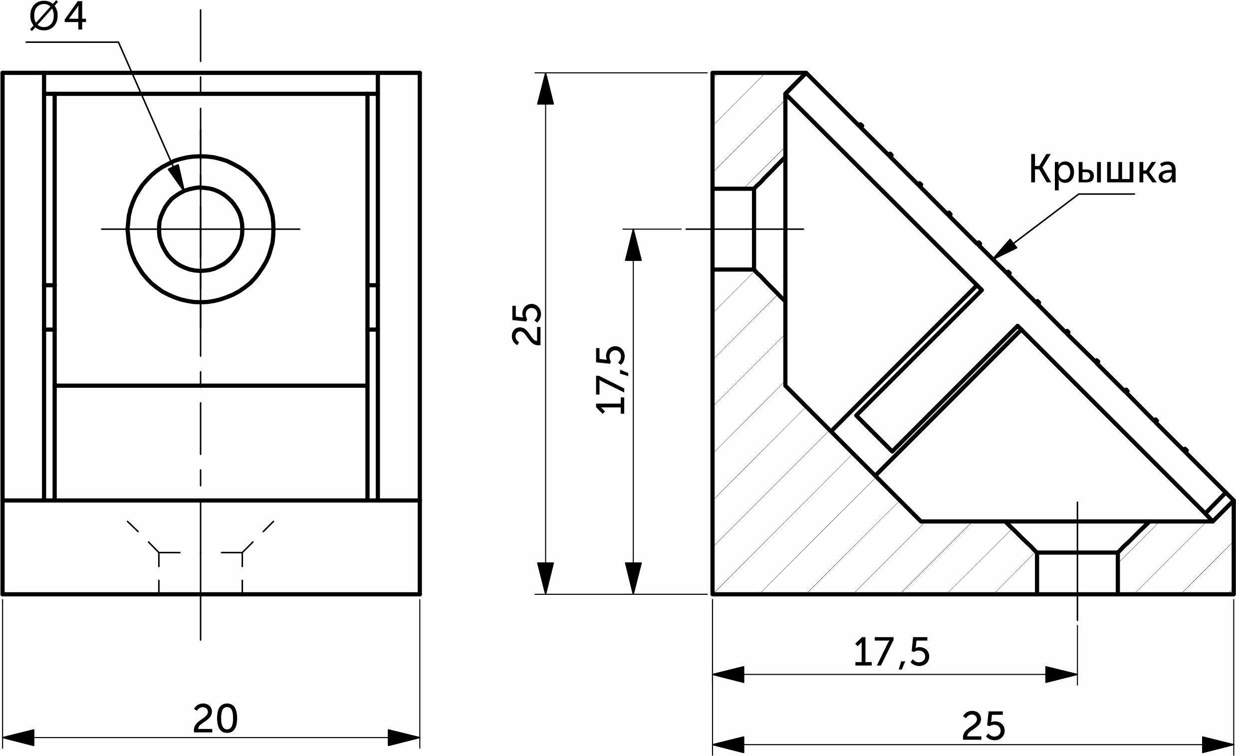 Один из видов одинарных пластиковых уголков (командорок), имеющий отдельную крышку, которая вставляется в уголок для скрытия крепежных отверстий. Данный уголок представлен в нескольких цветах, чтобы можно было подобрать к определенному цвету ДСП, и имеет треугольную форму. Данный вид соединения менее прочен, чем металлические уголки, но данные недостатки компенсируются низкой ценой и разнообразием цветов.