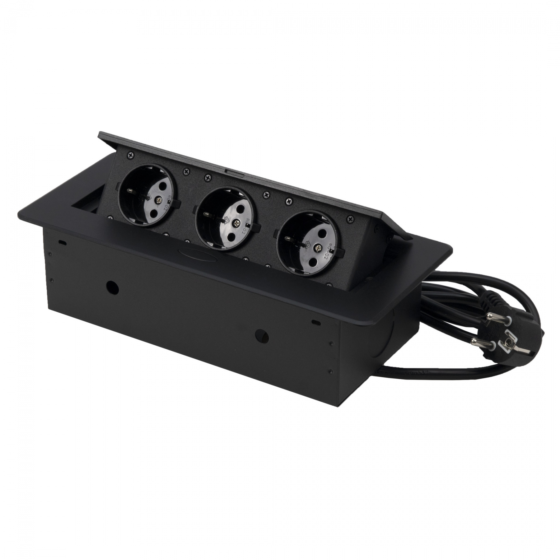 Наружный размер 266х133х67мм, монтажный размер 223х109х65мм, степень защиты IP20, длина кабеля 2м, электробезопасность 16A с заземлением и проводами с поперечным сечением 1,5 mm². 3 евророзетки с заземлением 220В (Schuko), цвет белый.