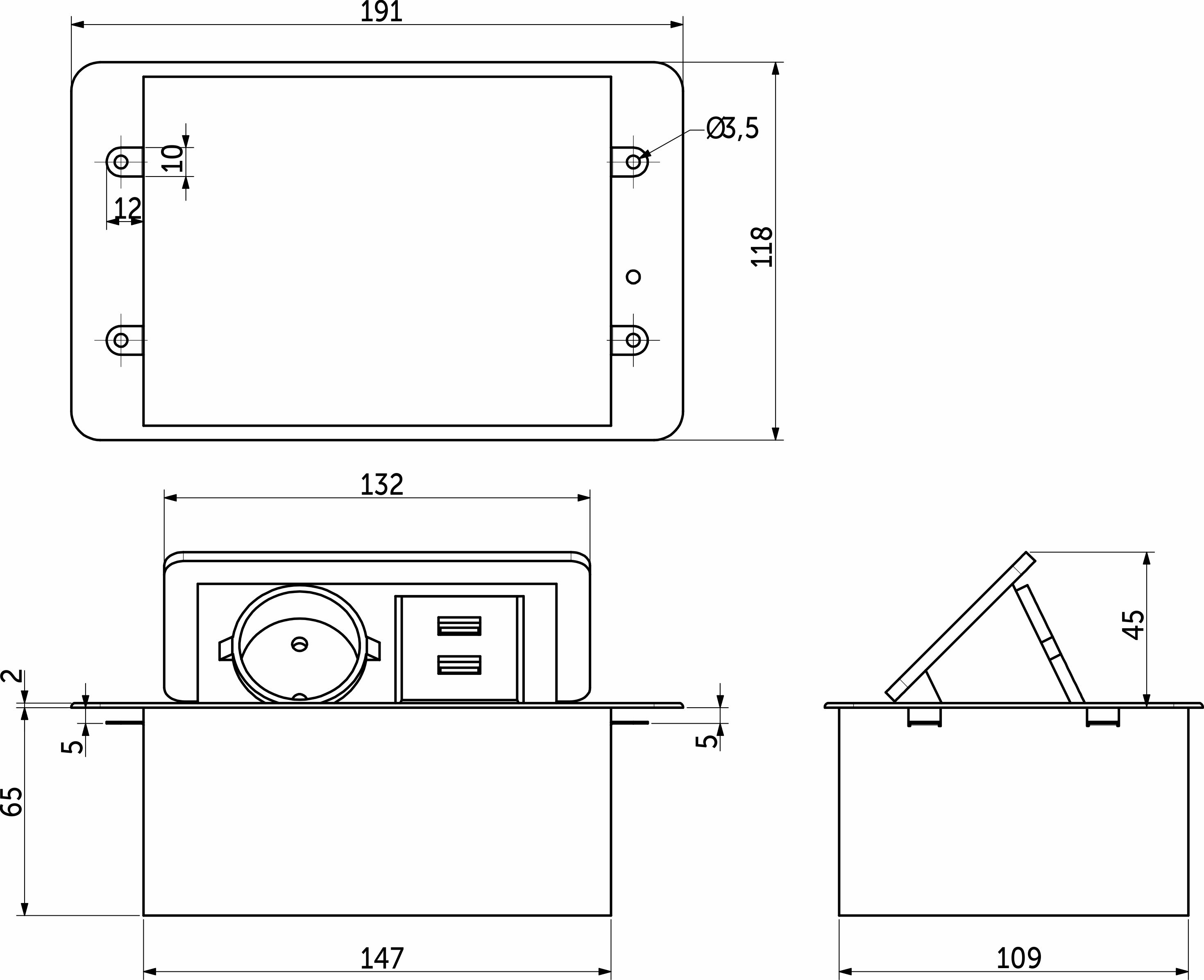 Мебельный удлинитель AKS NOVA 4. Евророзетка 220В/10А, максимальная мощность 2,5кВт, 2xUSB-Ax5В/2,1А для зарядки гаджетов, степень защиты IP20. Габаритные размеры врезной части 130x110x65мм, габаритные размеры верхней части 138х134х2мм, длина шнура 1,5м