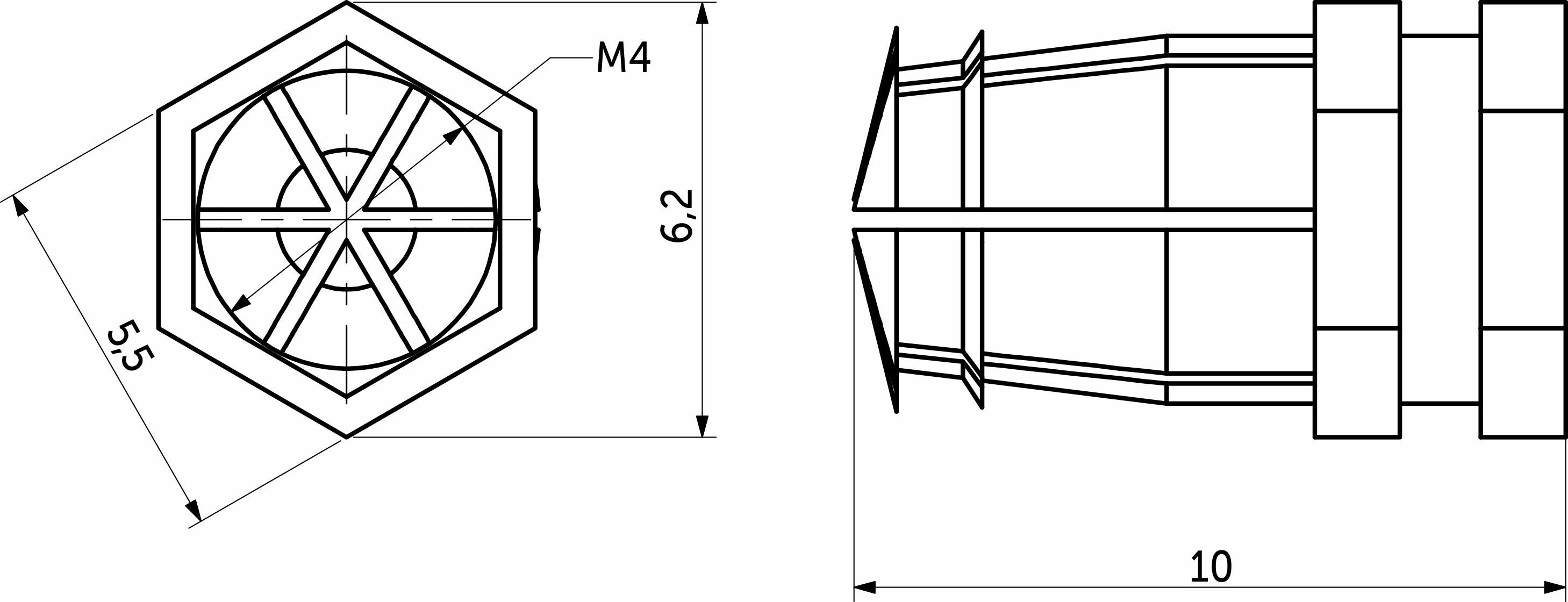 Втулка латунная вбиваемая (муфта или футорка распорная) забивается в отверстие в пластине (ДСП) для увеличения прочности соединения между пластиной и установленным элементом. При вкручивании устанавливаемого элемента (например штока эксцентрика) происходит расширение разрезной части и надежная фиксация в материале. Внутренняя резьба данной втулки, как правило, метрическая (М4)