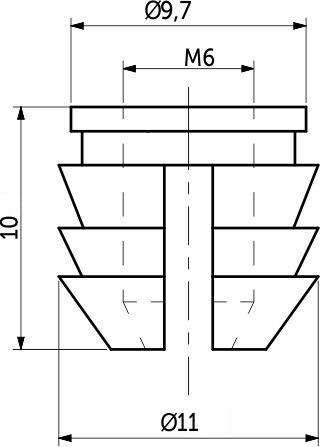 Втулка пластиковая вбиваемая (муфта или футорка распорная) забивается в отверстие в пластине (ДСП) для увеличения прочности соединения между пластиной и установленным элементом. При вкручивании устанавливаемого элемента (например штока эксцентрика) происходит расширение разрезной части и надежная фиксация в материале. Внутренняя резьба данной втулки, как правило, метрическая (М4 или М6).