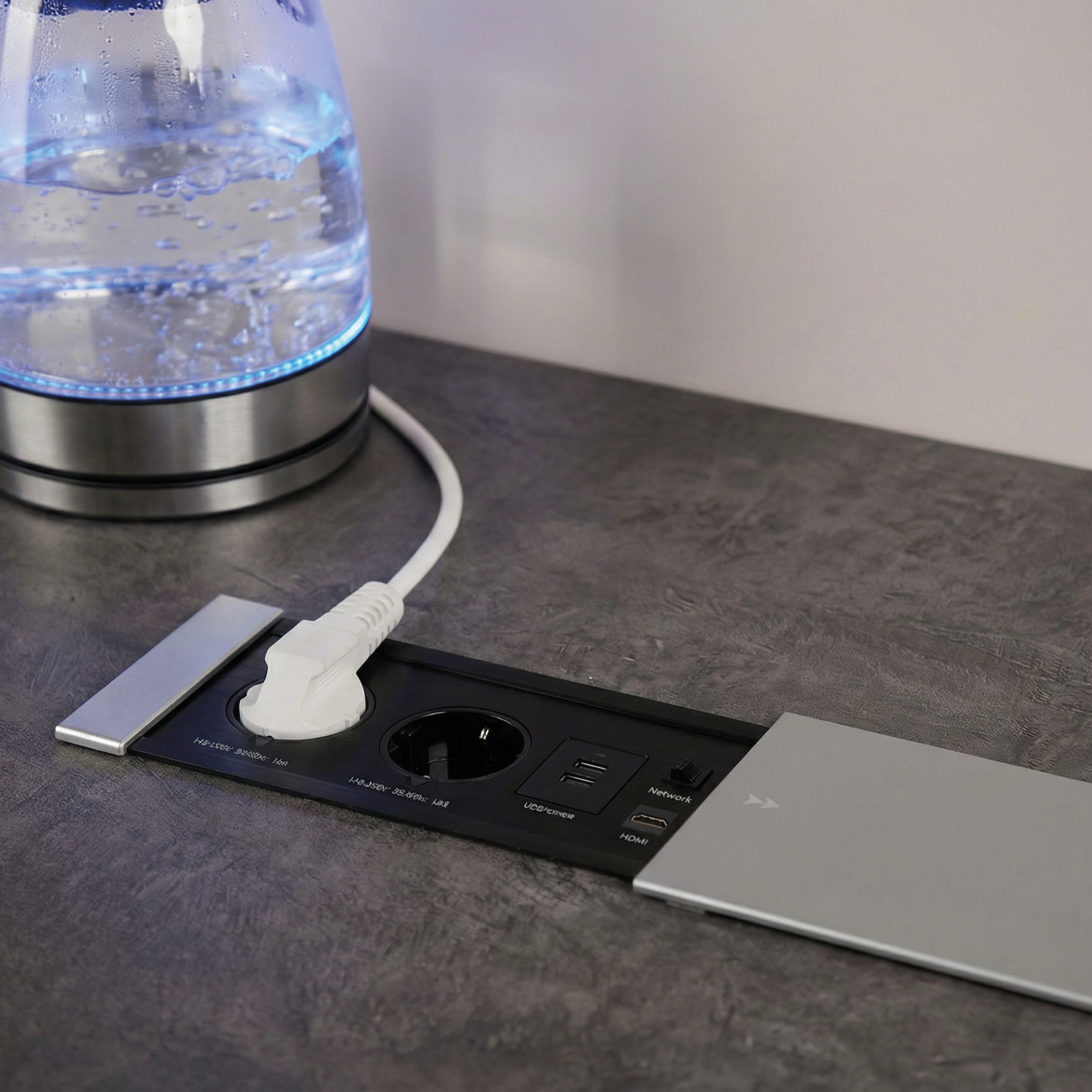 Выдвижной удлинитель Hollander, 2 розетки, 2xUSB A, HDMI, LAN, шлиф. сталь AKS