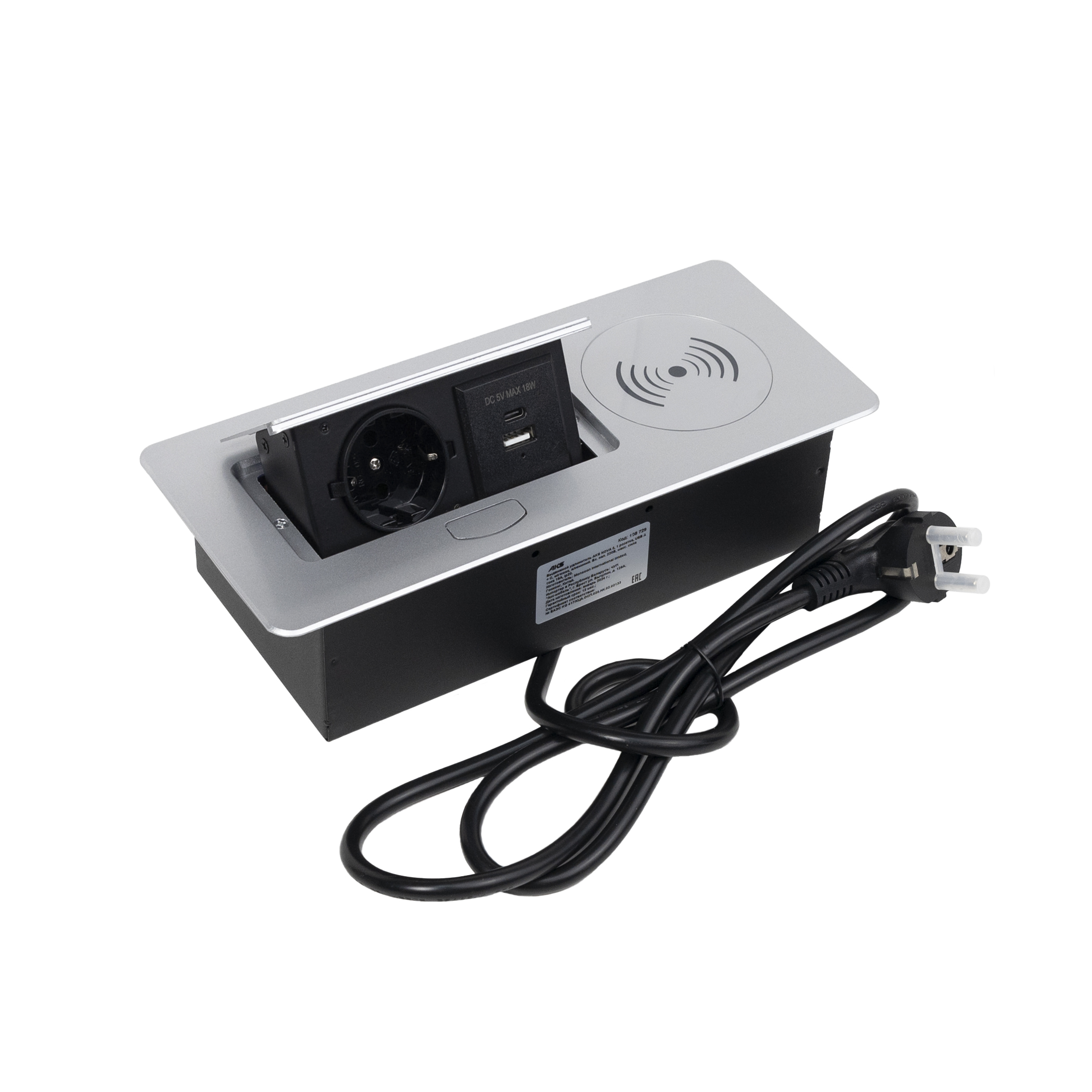 Выдвижной удлинитель Nova 5, 1 розетка, USB A + C, беспроводная зарядка, алюминий, AKS