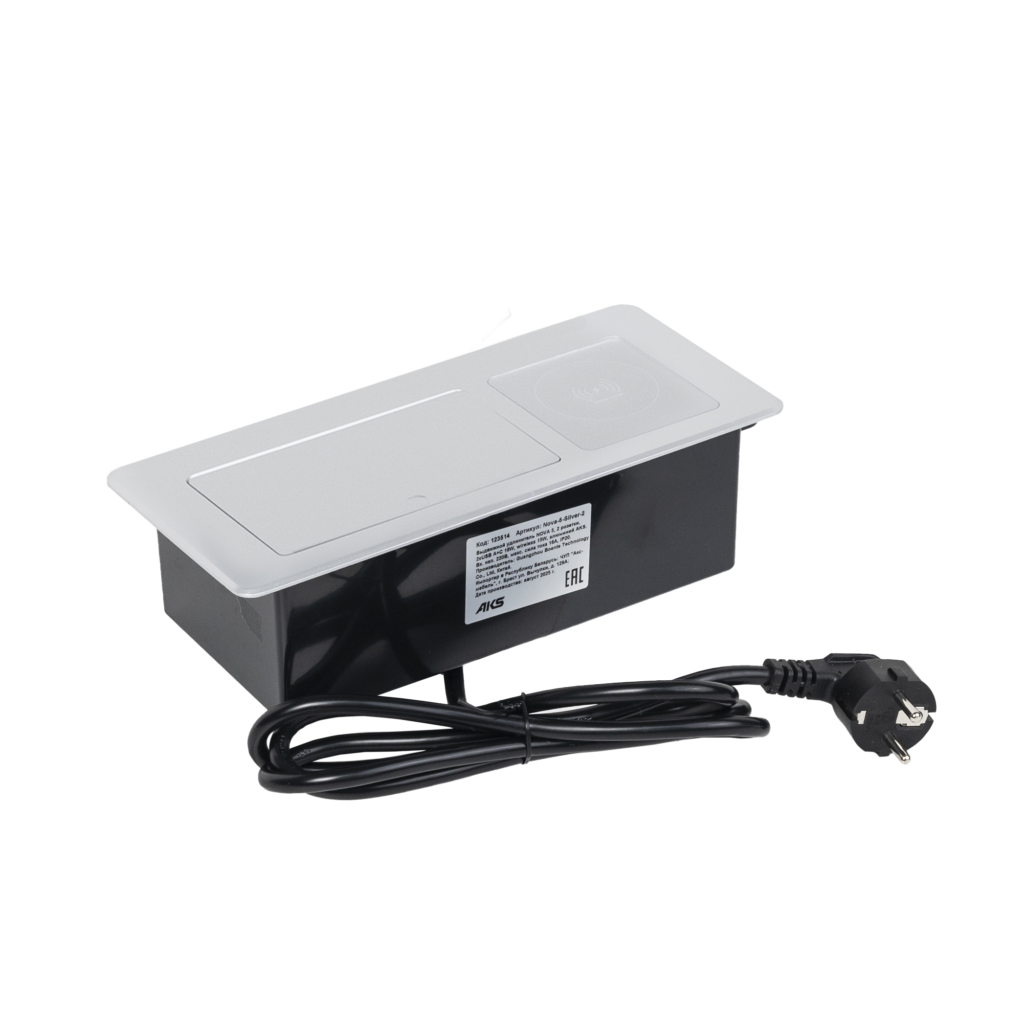 Выдвижной удлинитель Nova 5, 2 розетки, USB A + C, беспроводная зарядка, алюминий, AKS