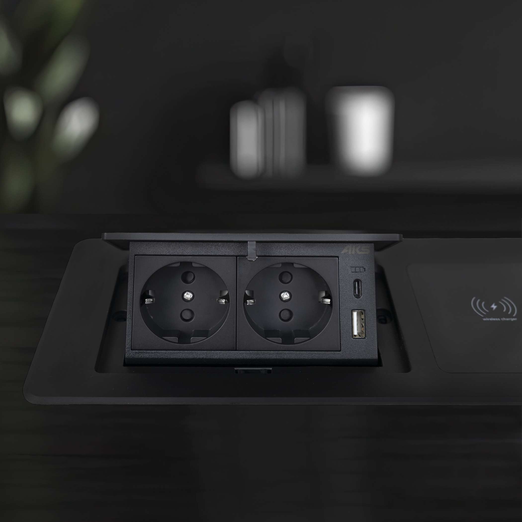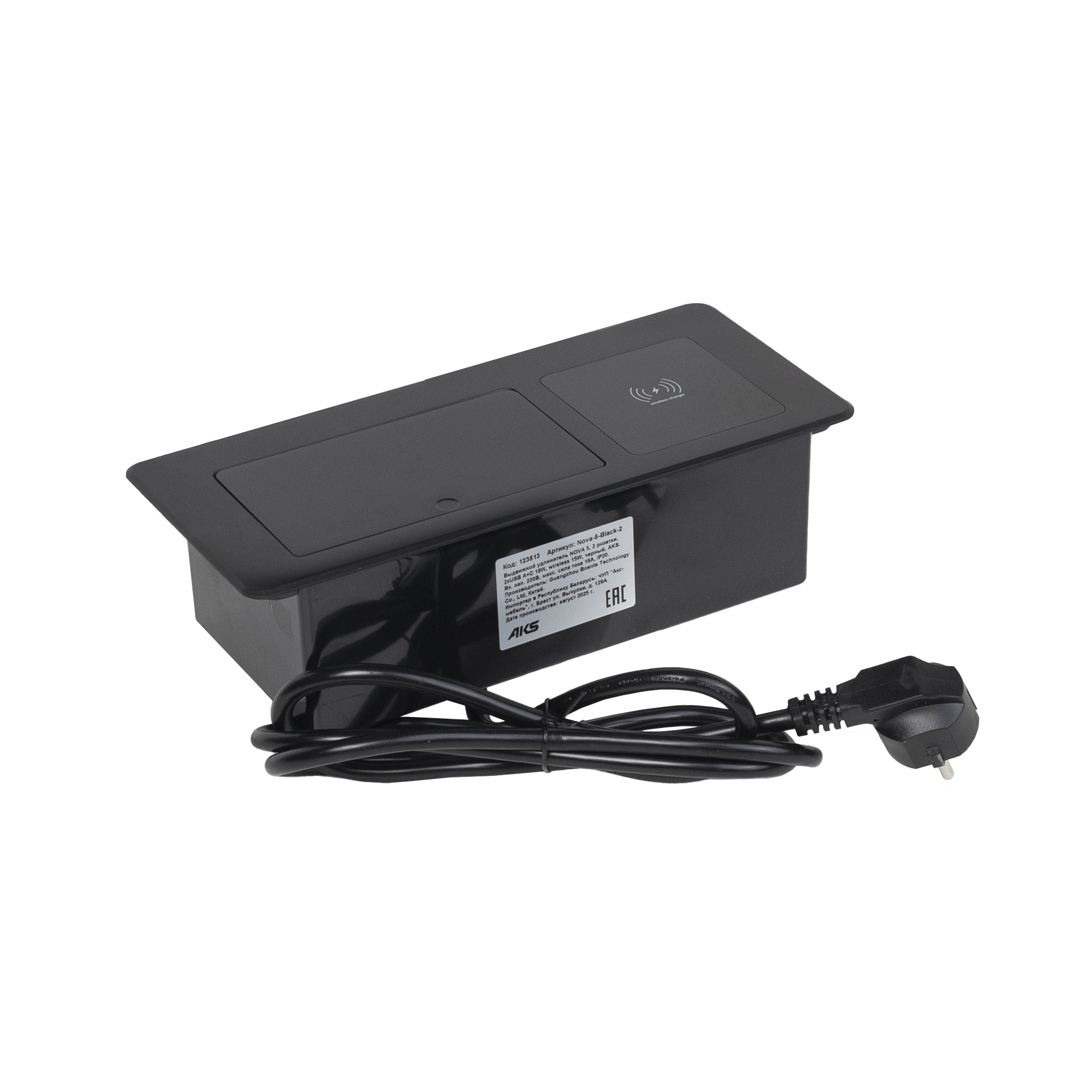 Выдвижной удлинитель Nova 5, 2 розетки, USB A + C, беспроводная зарядка, черный, AKS
