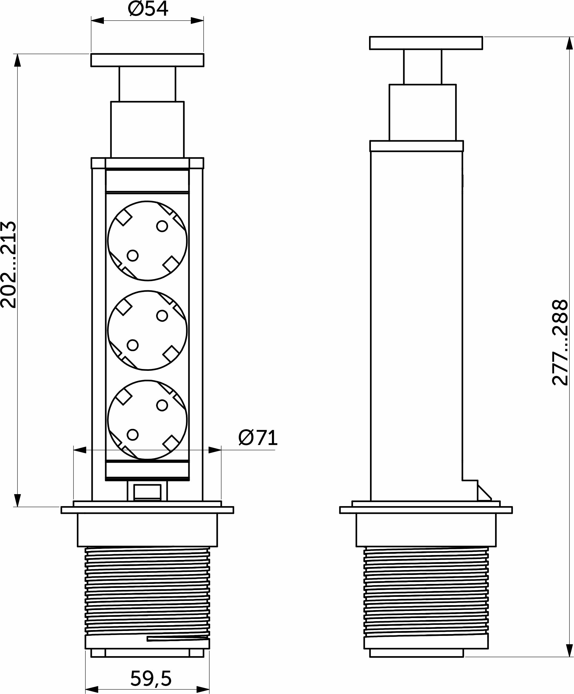 Выдвижной удлинитель Vulcan, 60 мм, 3 розетки, крышка металл, шлифованная сталь, AKS