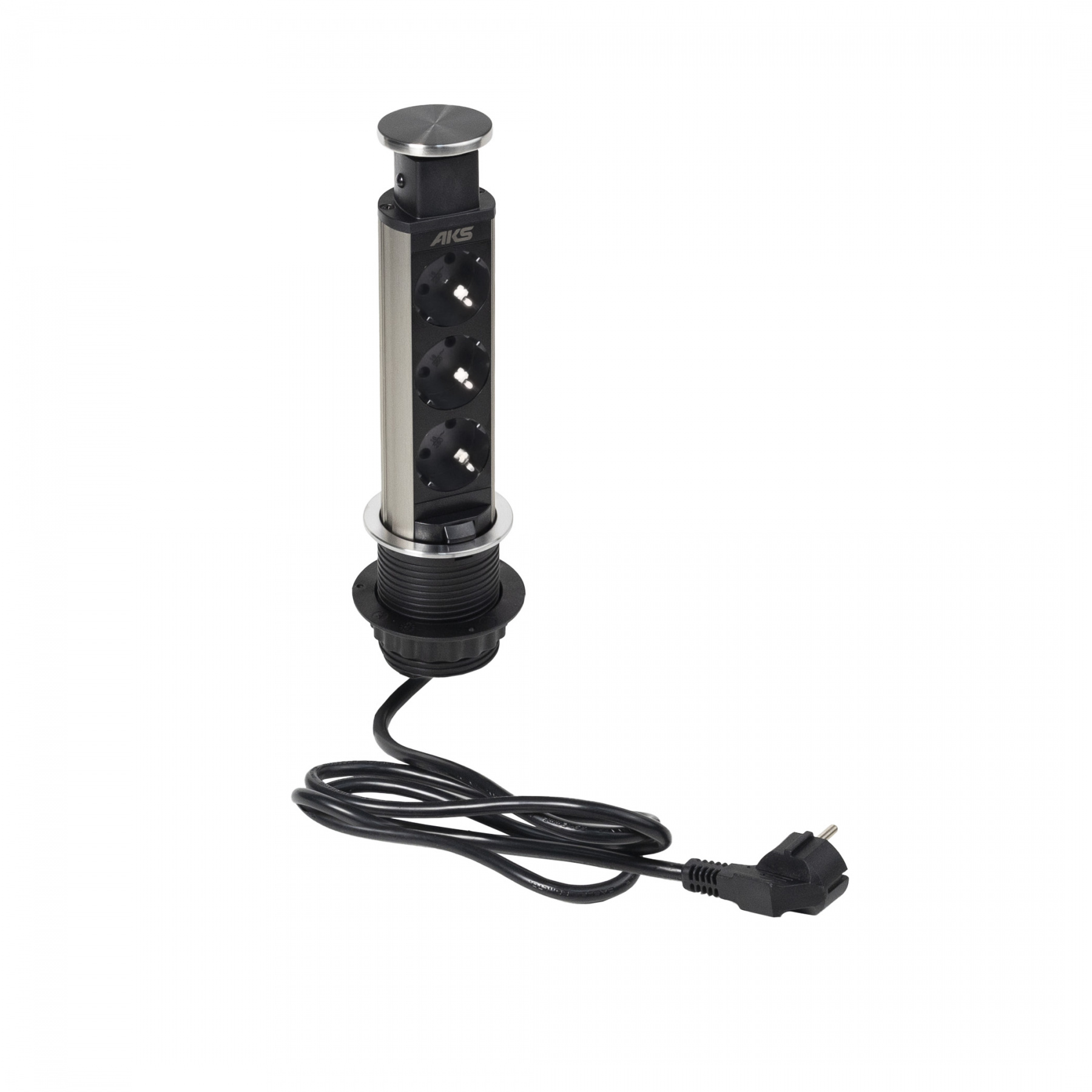 Настольный скрытый разветвитель AKS Vulcan, 60 мм 3 розетки (Schuko) цвет алюминий, входное напряжение 220В, выходное напряжение 220В, максимальная сила тока 16А, длина шнура 2м, макс. мощность 3600Вт.