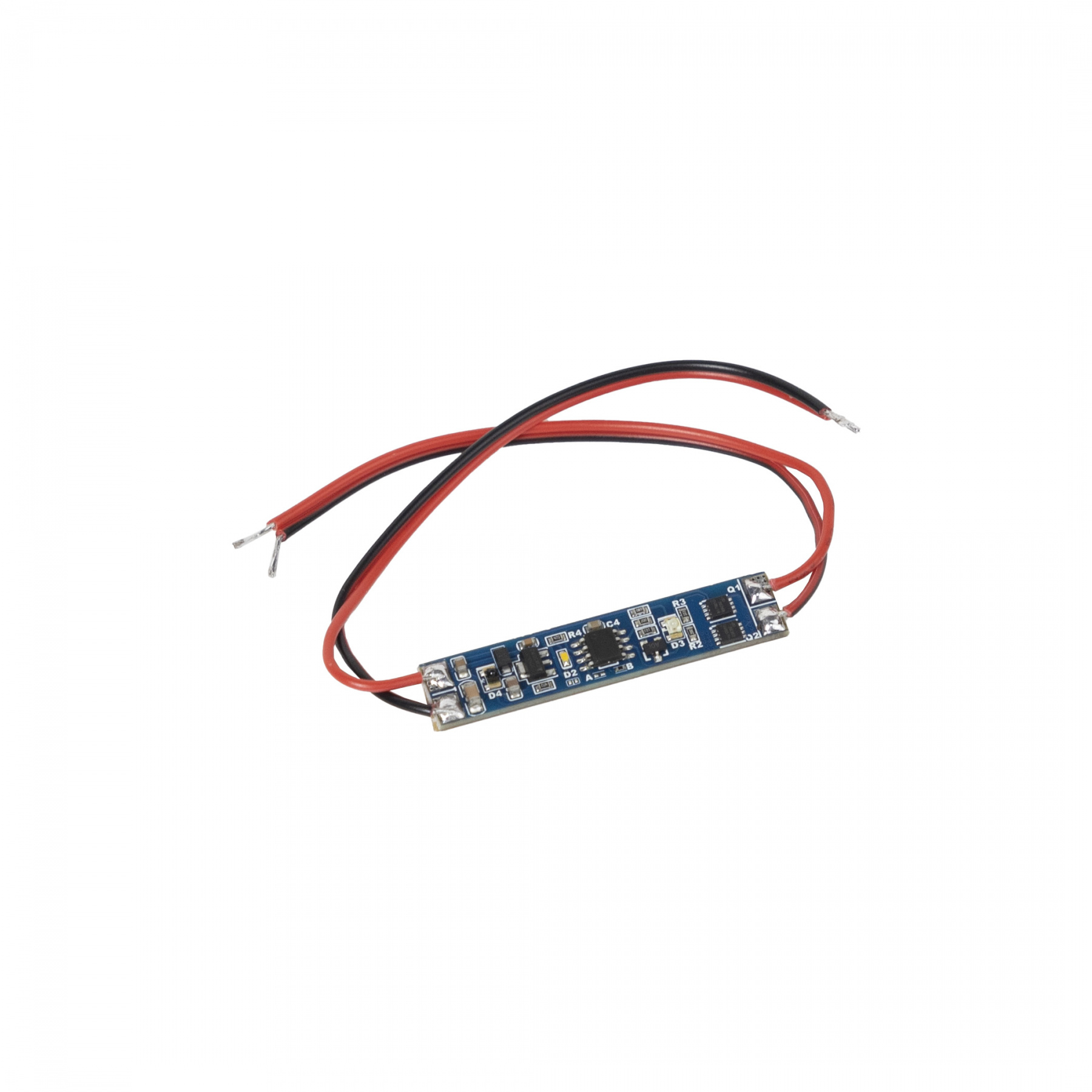 Сенсорный переключатель с диммированием и с припаянными проводами (10 см), устанавливается в профиль для светодиодной ленты, срабатывает на взмах руки на расстоянии до 100 мм, задерживание руки возле датчика регулируется яркость освещения, входное напряжение 12В/24В, максимальная мощность 96Вт/192Вт, степень защиты IP20.