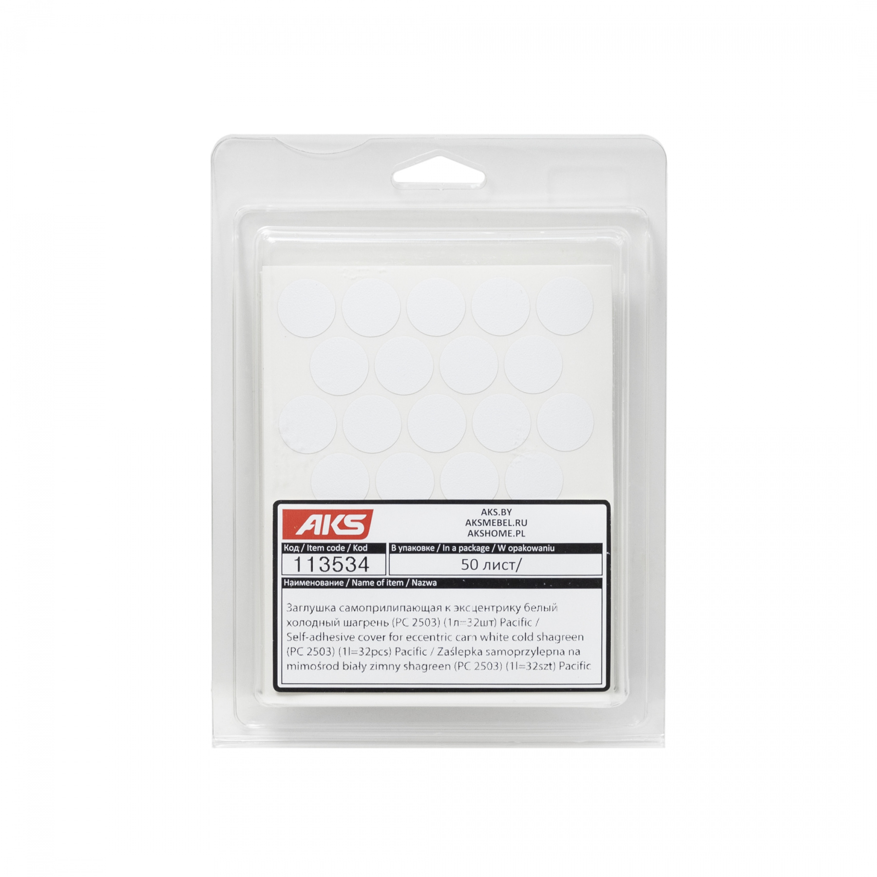 Заглушка самоприлипающая к эксцентрику белый шагрень (20322) AKS (лист-28шт.)