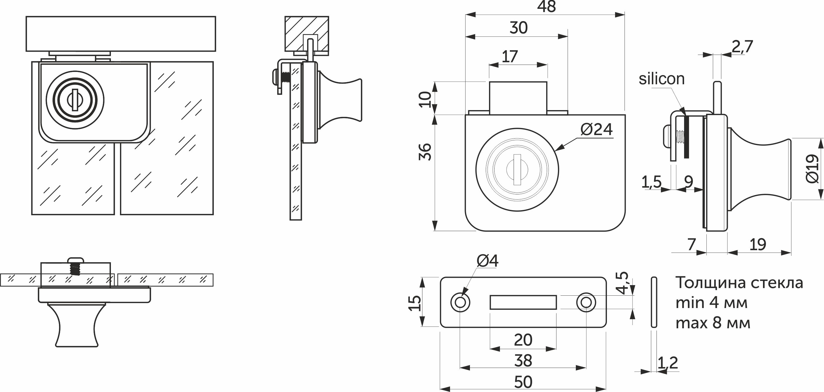 Замок для распашных стеклянных дверей. Данная модель является накладной, для её монтажа не требуется сверление стекла. Возможен монтаж стекла толщиной 4-8 мм.