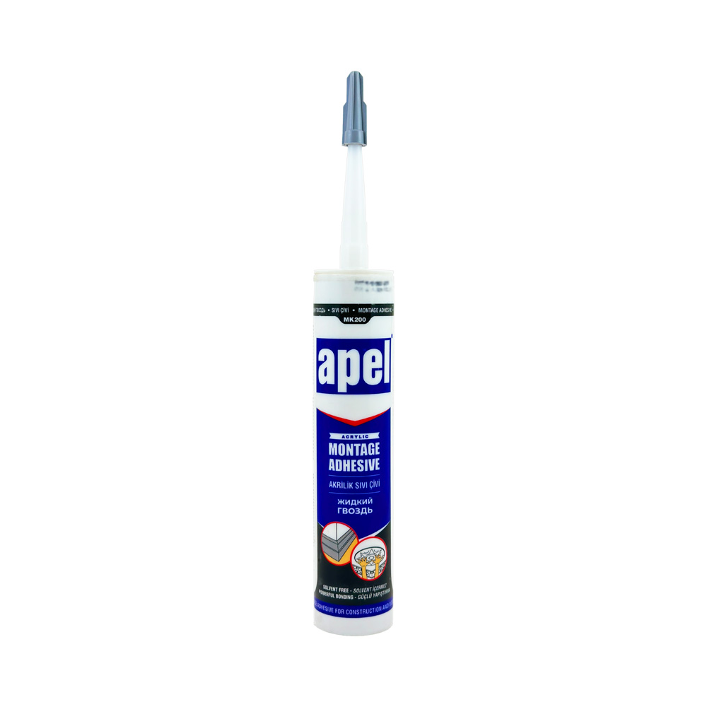 Жидкий гвоздь APEL MK200 – это однокомпонентный водный акриловый клей для надежного склеивания различных строительных материалов. Используется при монтаже деревянных, ПВХ, железных и алюминиевых конструкций, а также для заполнения деформационных швов в сборных элементах зданий.